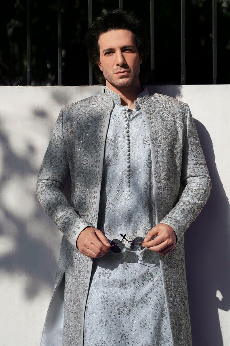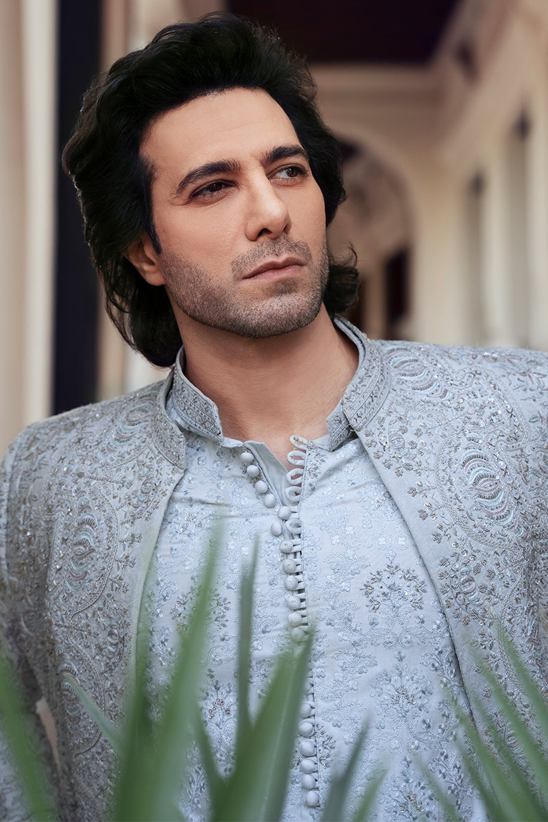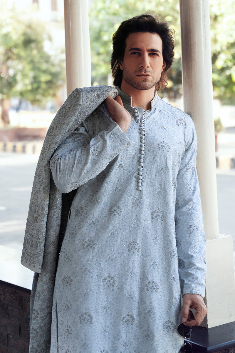 An ice blue embroidered kurta pajama set adorned with motifs inspired by floral and contemporary embroidered patterns.