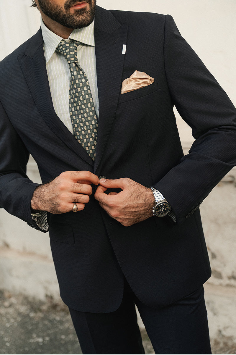 Sage green formal button-down shirt in classic fit, featuring a linear pattern and front patch pocket. Designed with contrasting white buttons, a cutaway collar, and buttoned sleeves.