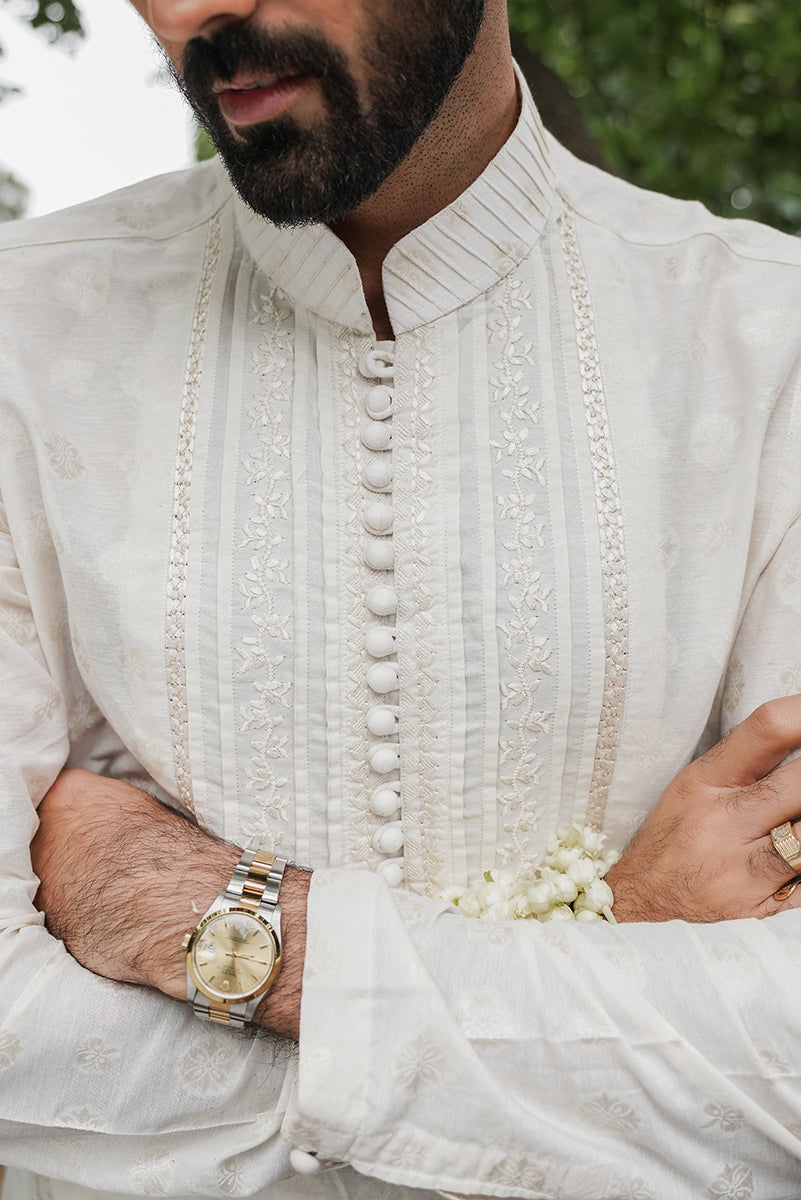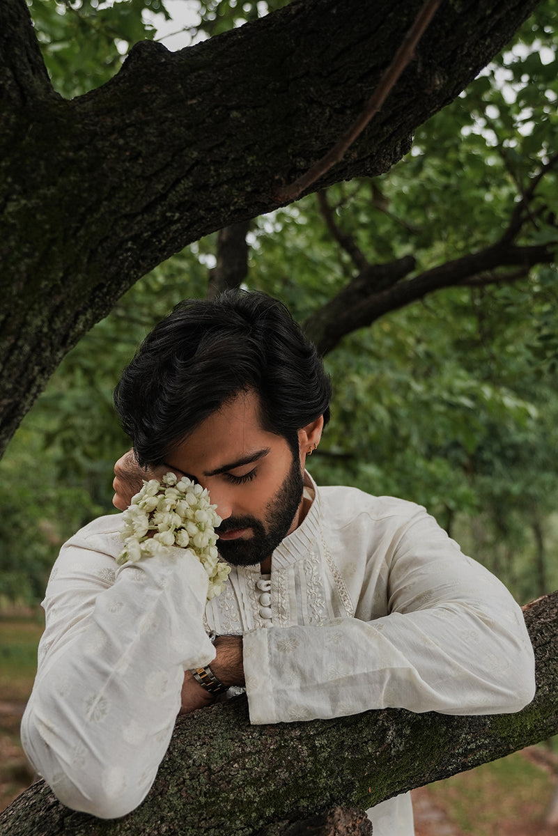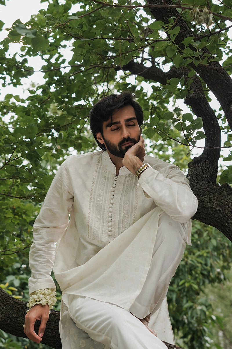 A pearl white, embroidered jacquard kurta, with pleating on the front panel. Paired with pearl white trousers.