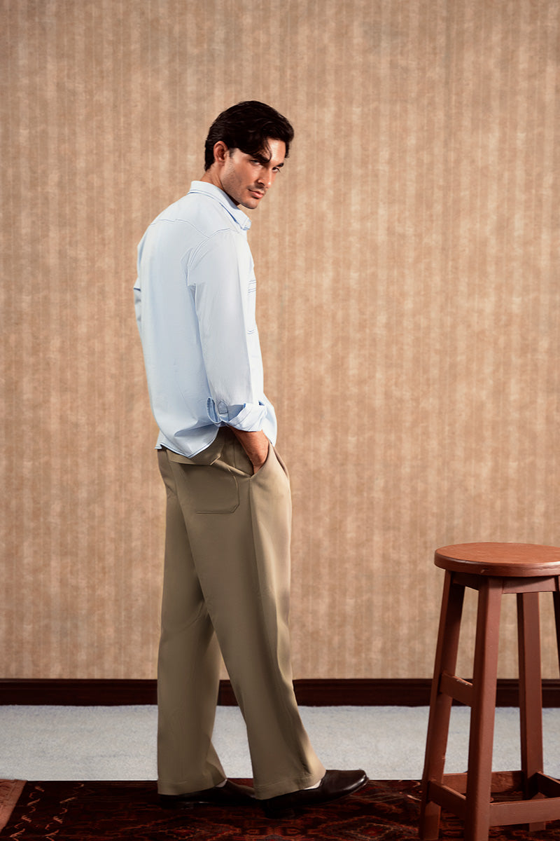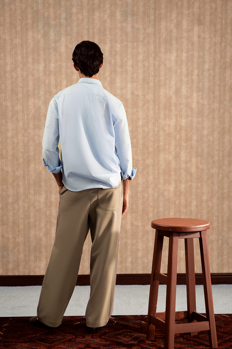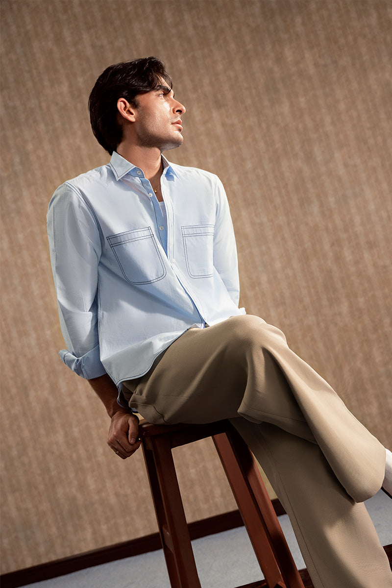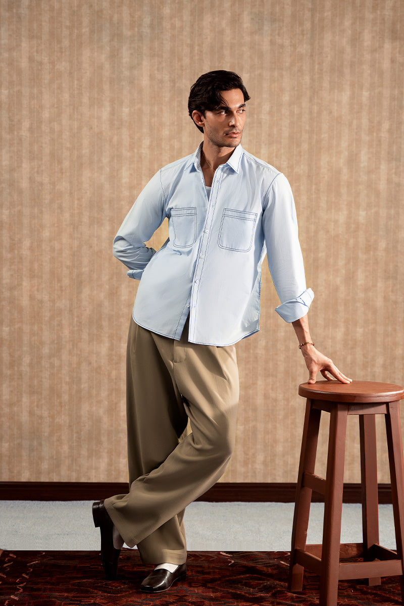 Blue linen button down shirt, with two patch pockets and an elevated dark bluetop-stitched detailing.