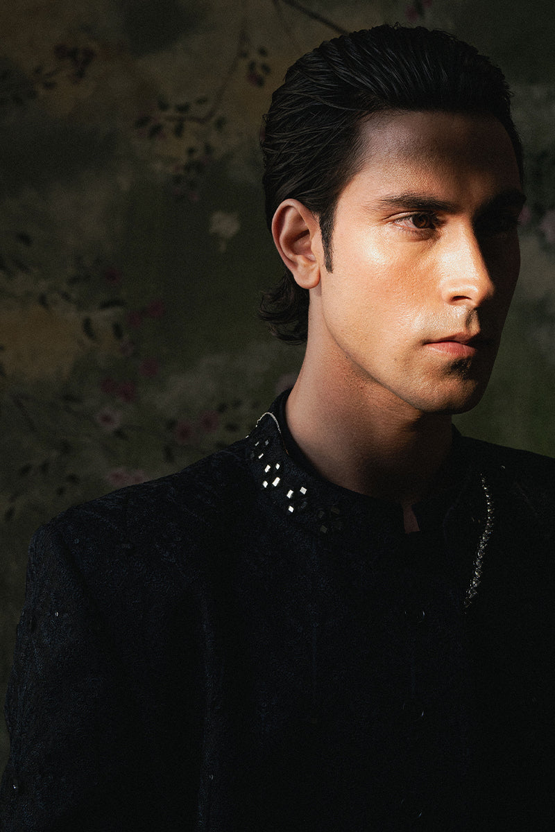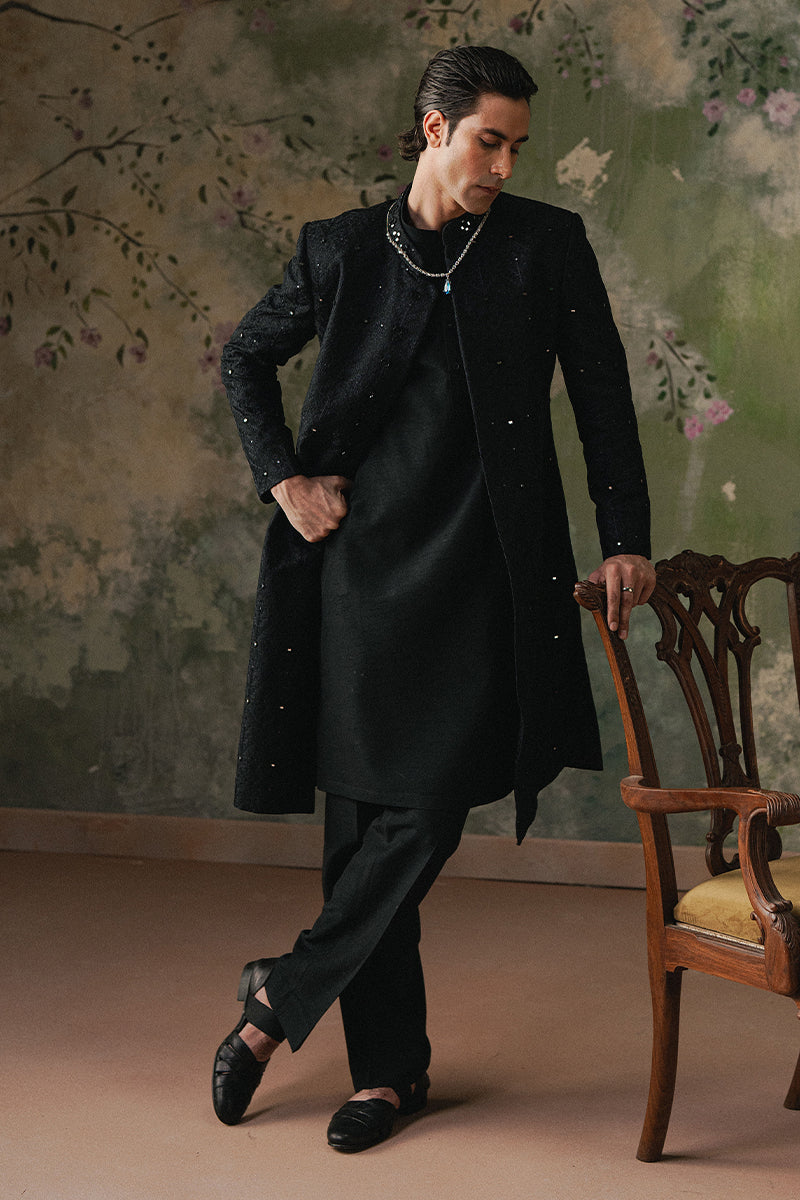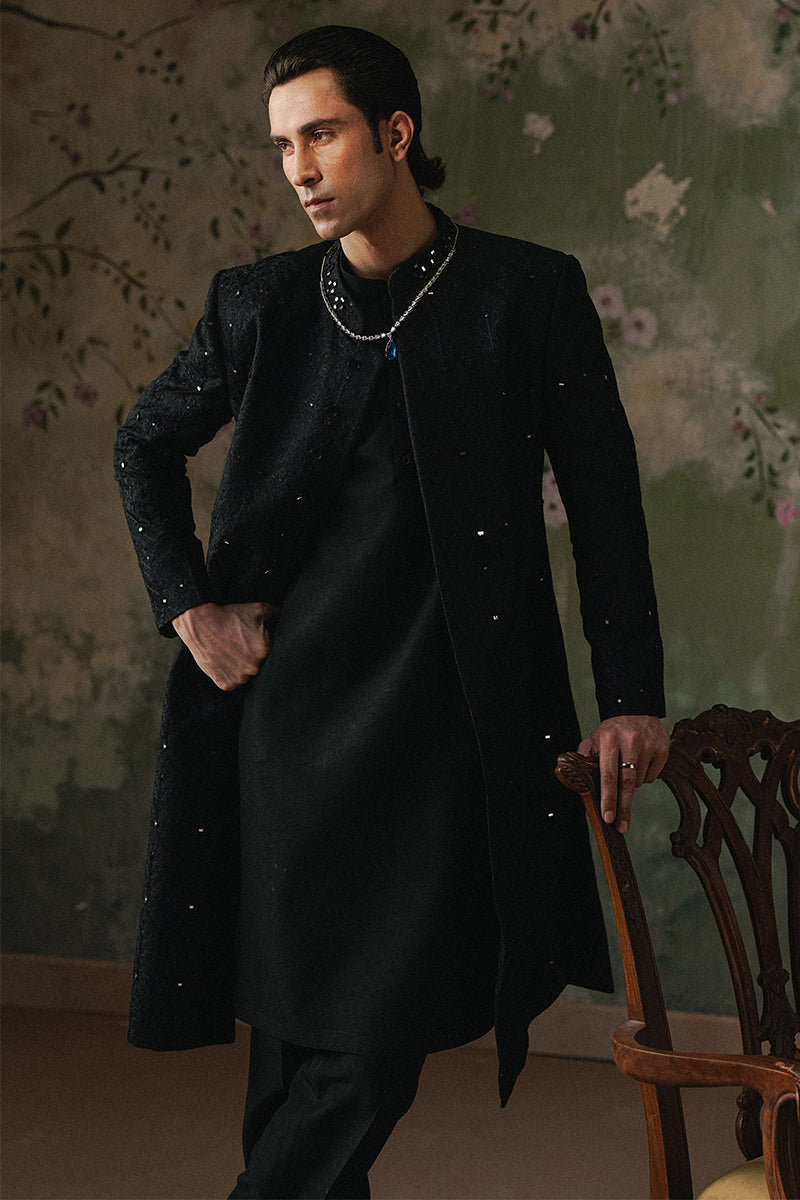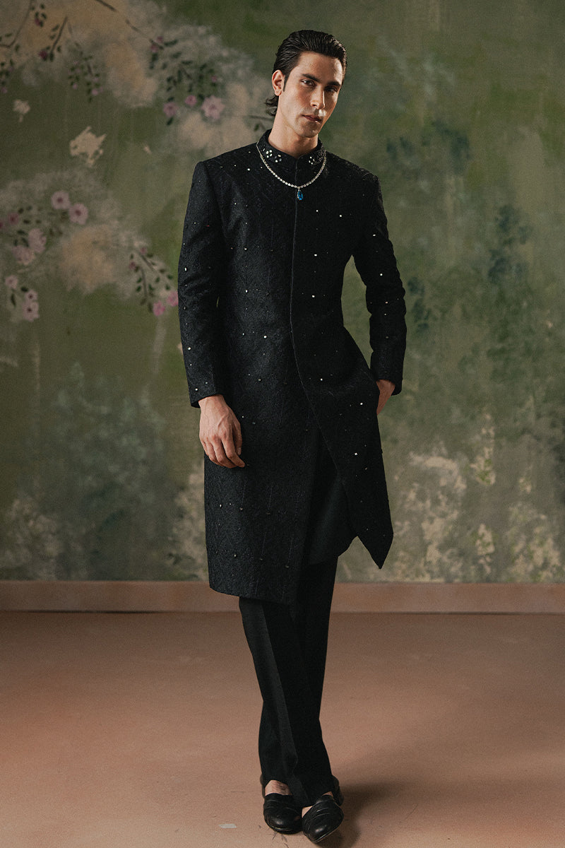 Onyx black embroidered sherwani adorned with all over midcentury floral embroidered pattern , featuring subtle sequin accents and a hand embellished mirror-work band collar. Crafted in rich Jamawar fabric.