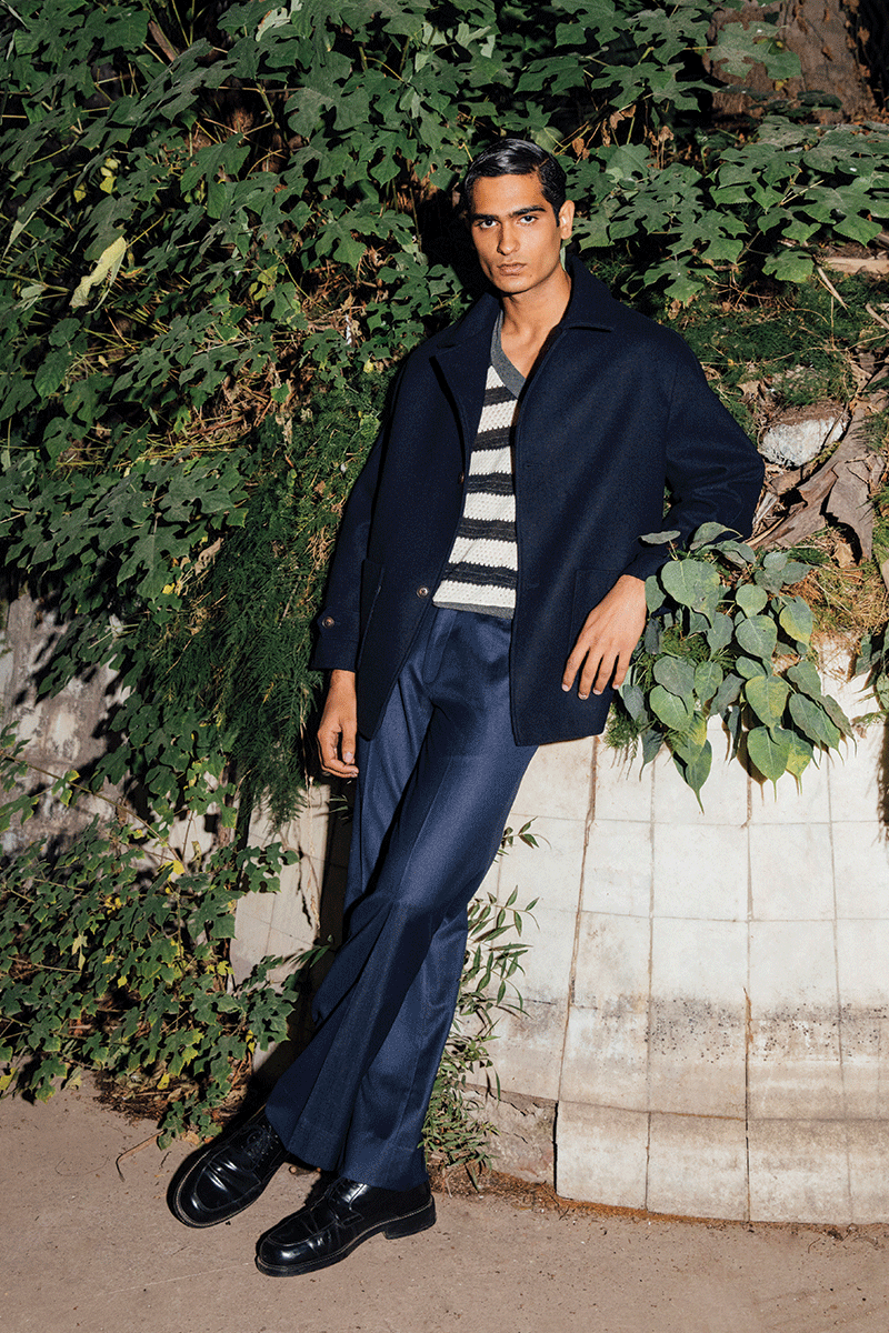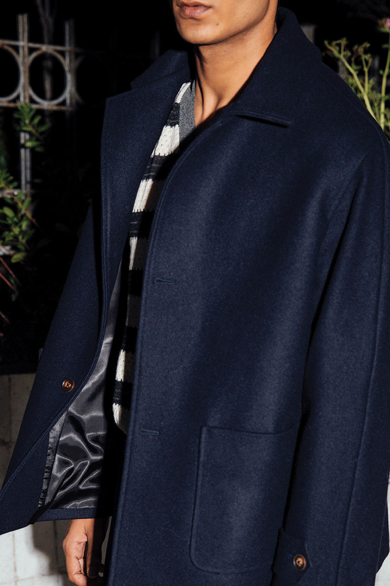 Classic, navy blue, tweed coat with front button fastening and full sleeves