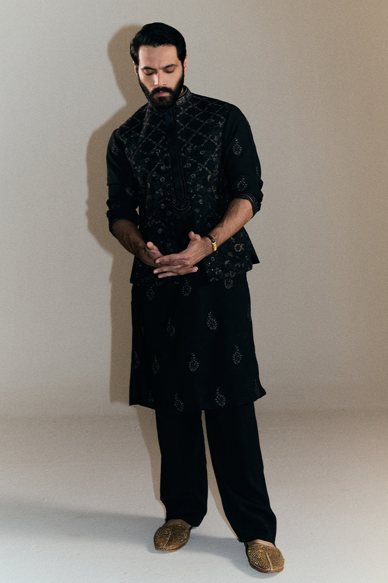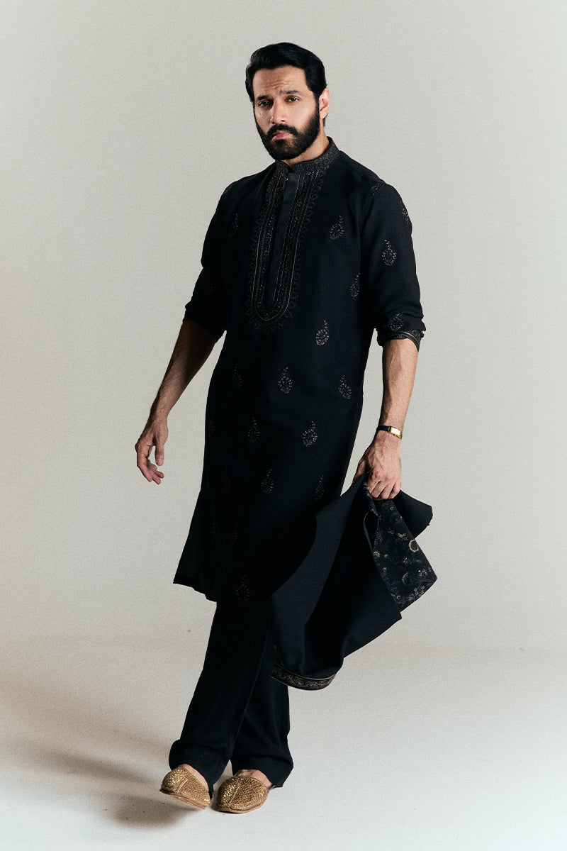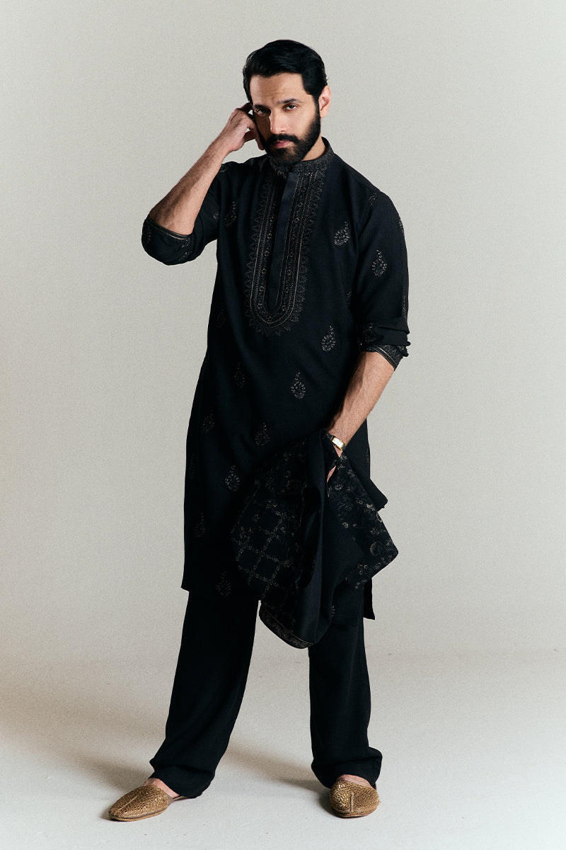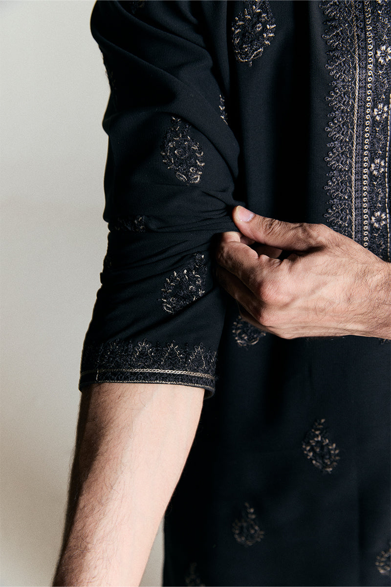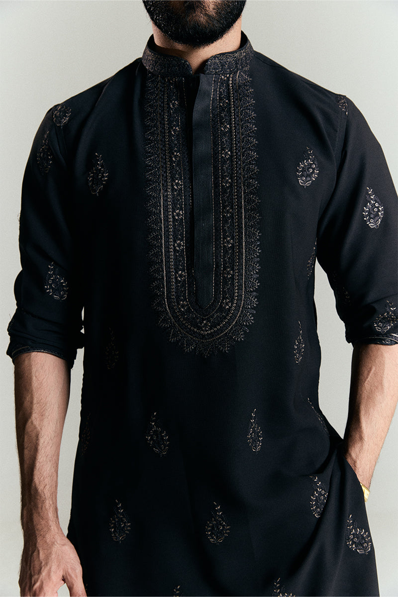 Ebony black embroidered kurta and pajama set detailed with floral and geometric embroidered patterns in gold tilla dori. Detailed with embroidered multi-summary floral embroidered band collar and cuff detailing.