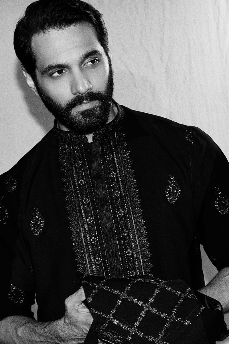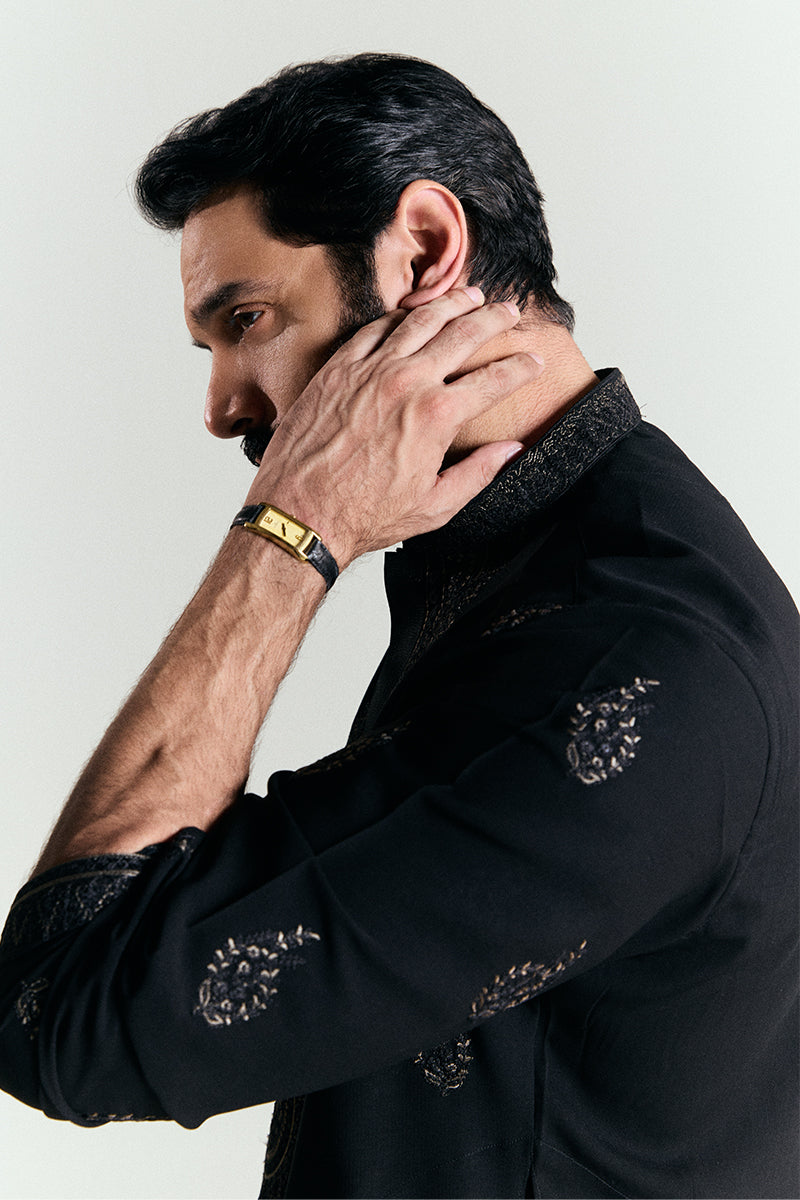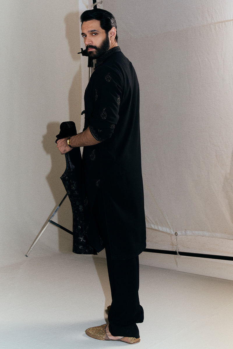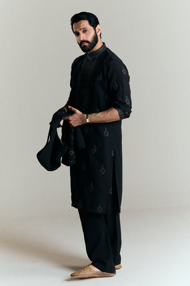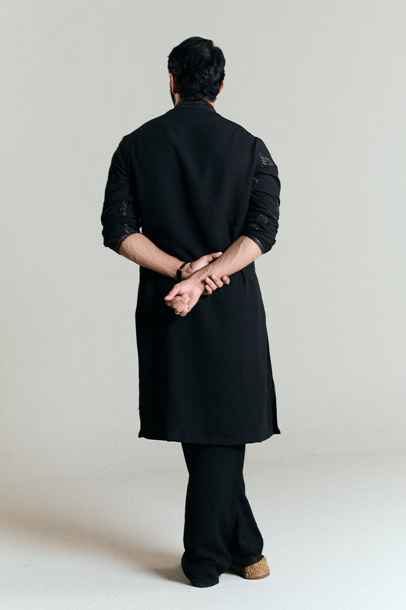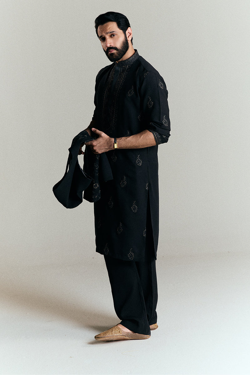 Ebony black embroidered kurta and pajama set detailed with floral and geometric embroidered patterns in gold tilla dori. Detailed with embroidered multi-summary floral embroidered band collar and cuff detailing.