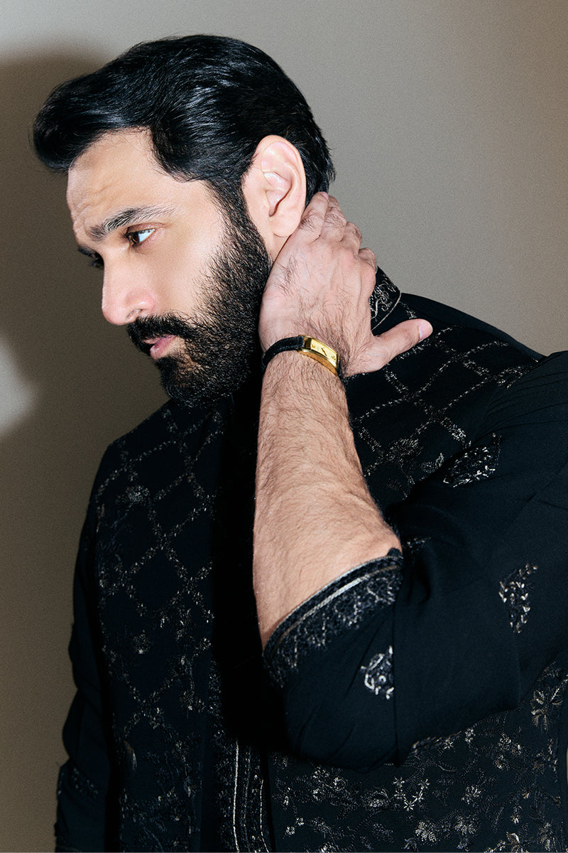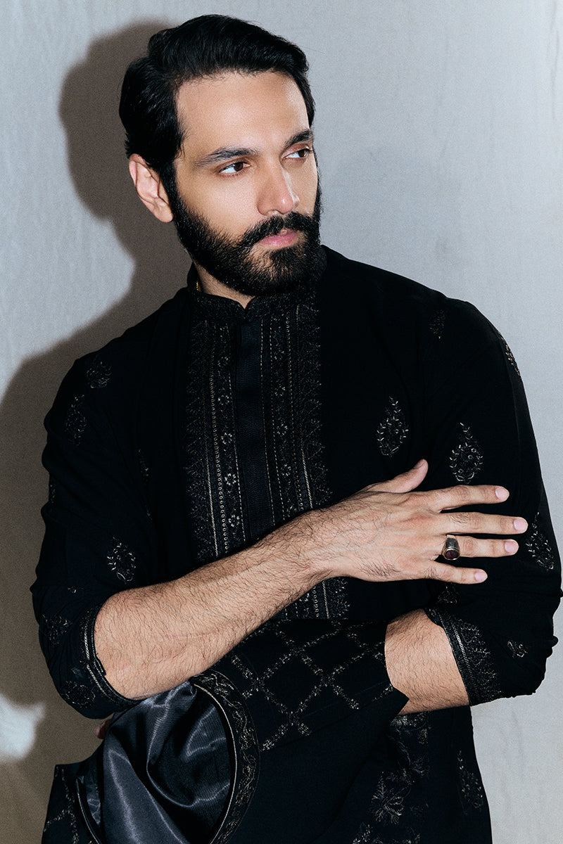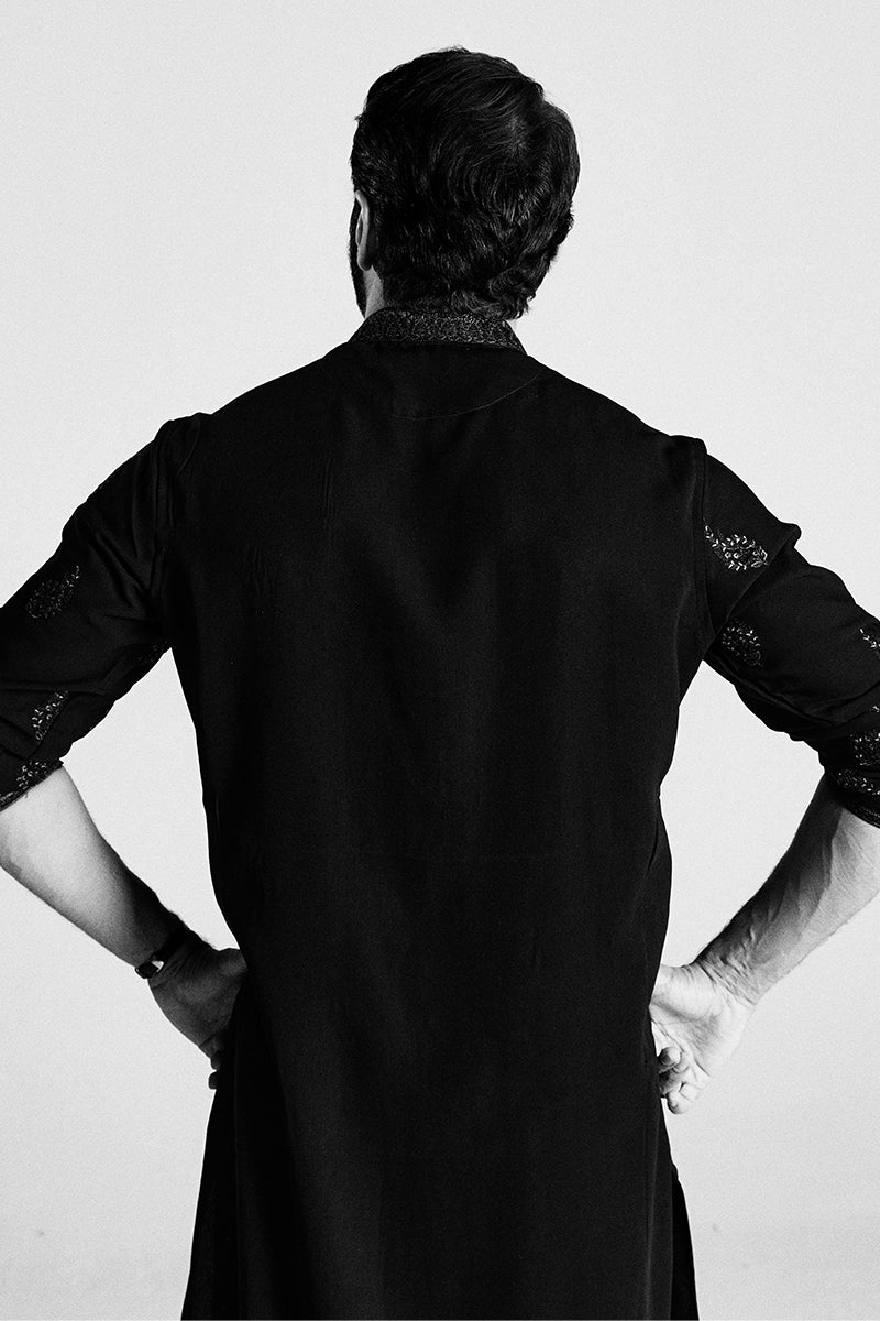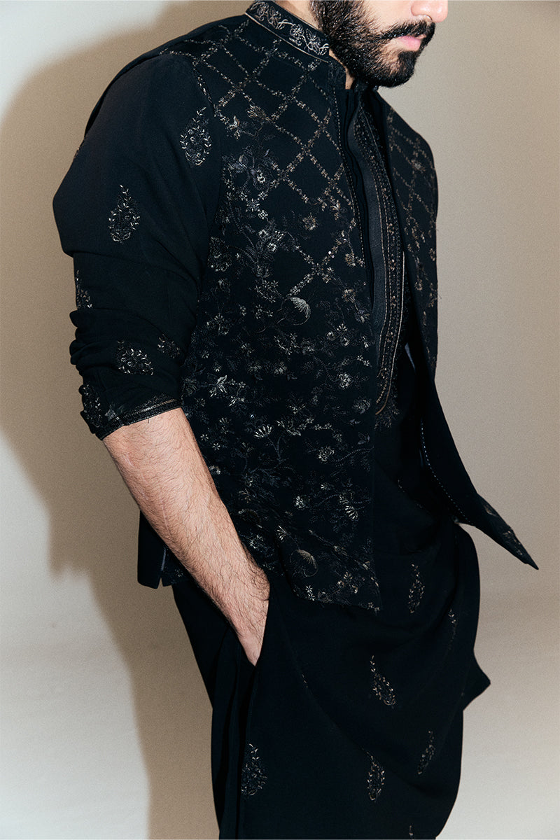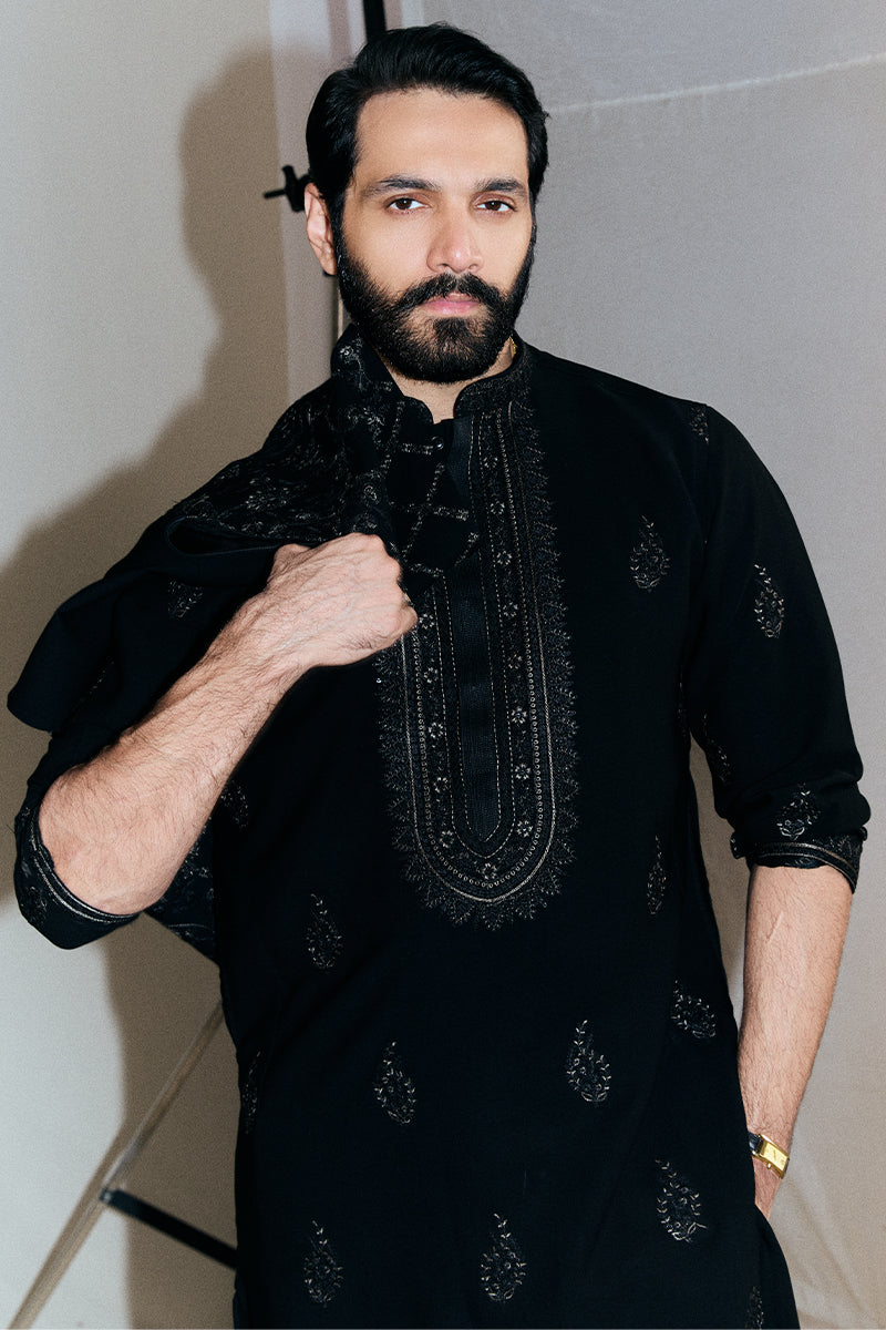 Ebony black embroidered kurta and pajama set detailed with floral and geometric embroidered patterns in gold tilla dori. Detailed with embroidered multi-summary floral embroidered band collar and cuff detailing.
