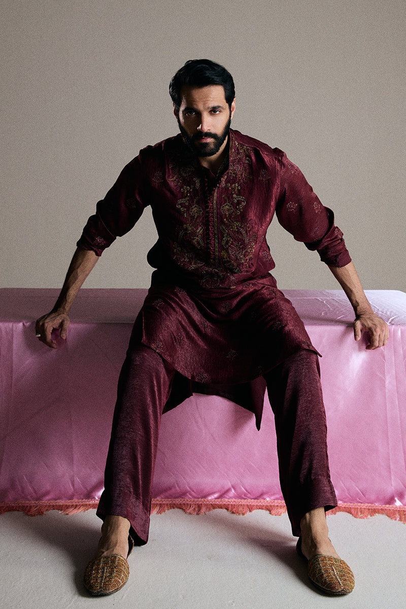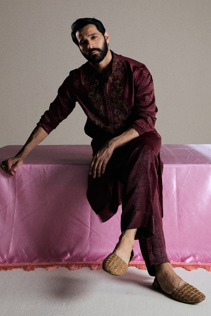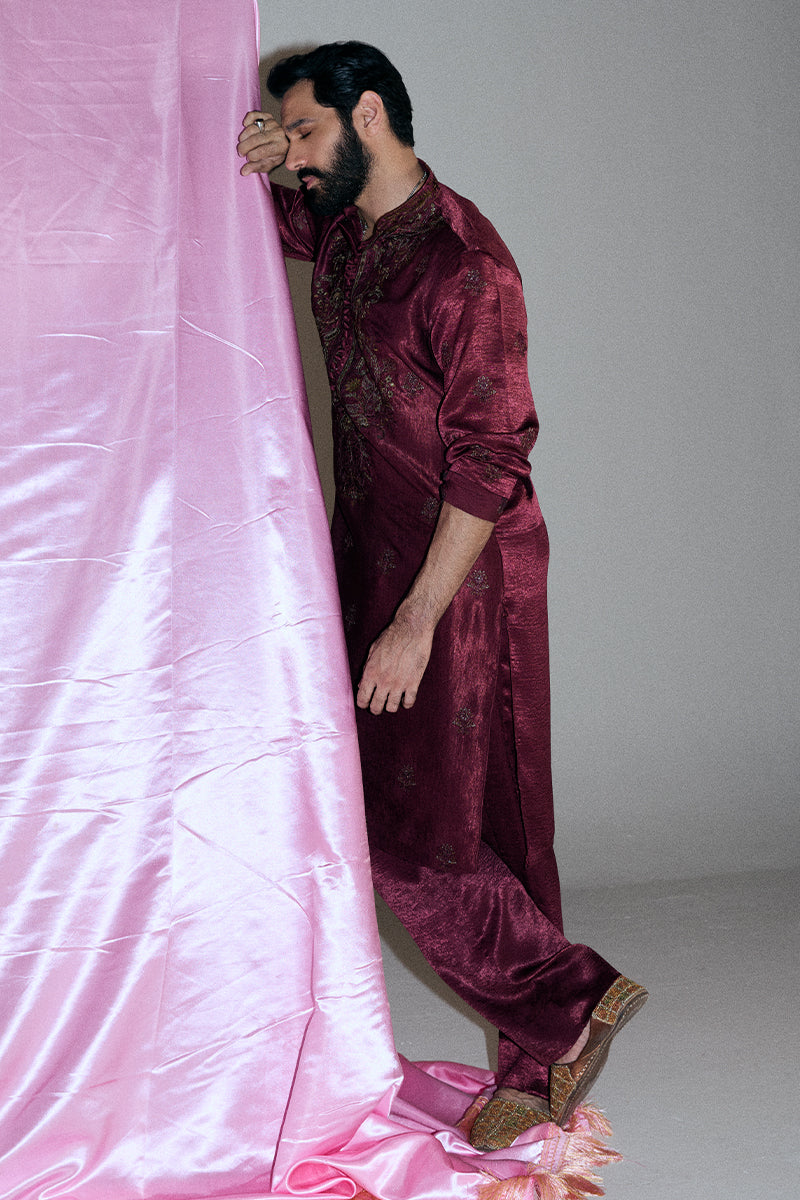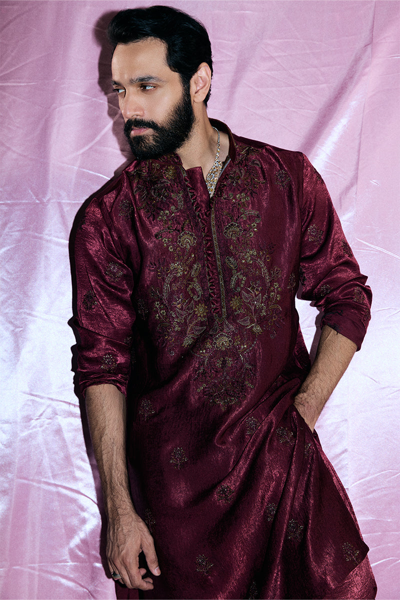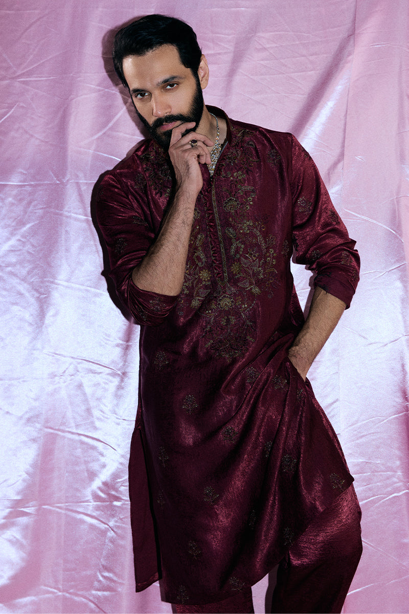 A deep burgundy kurta and pajama set adorned with striking floral embroidered composed neckline and all-over booti chatta accented with shimmering sequins, exuding opulence and refined elegance.