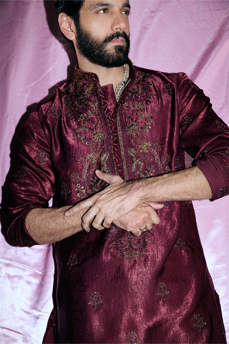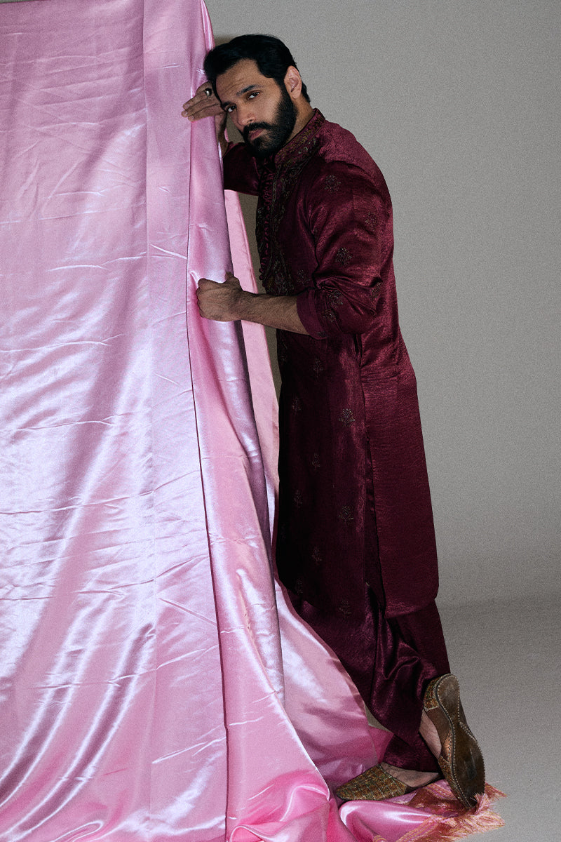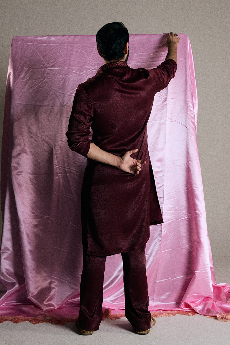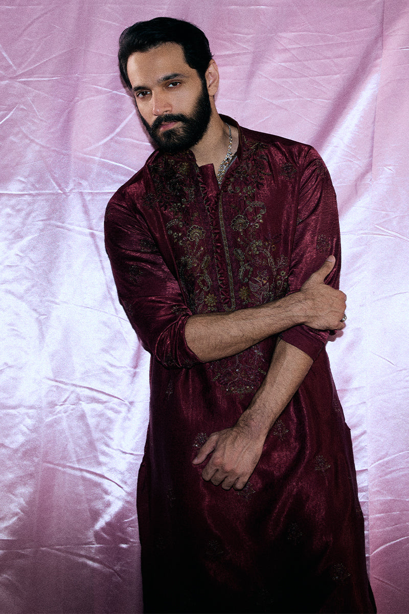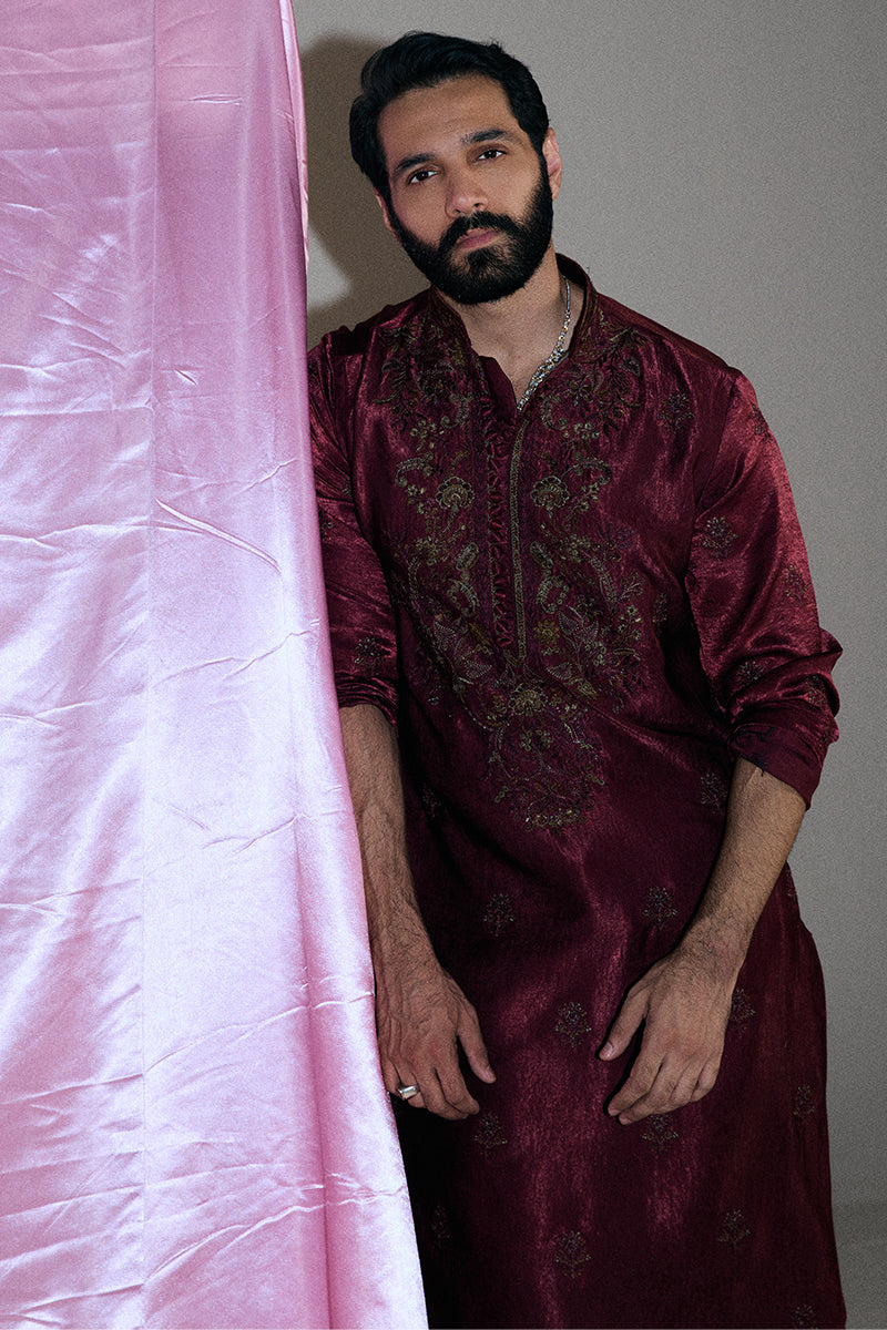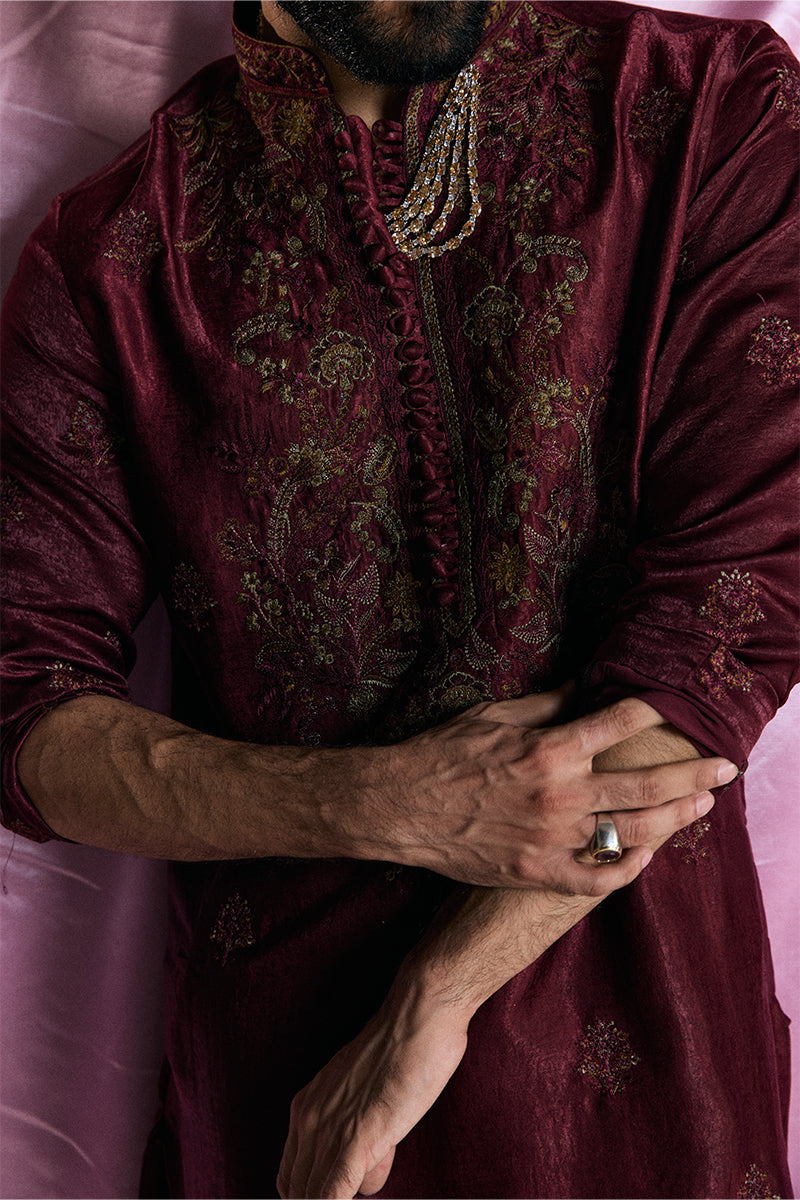 A deep burgundy kurta and pajama set adorned with striking floral embroidered composed neckline and all-over booti chatta accented with shimmering sequins, exuding opulence and refined elegance.