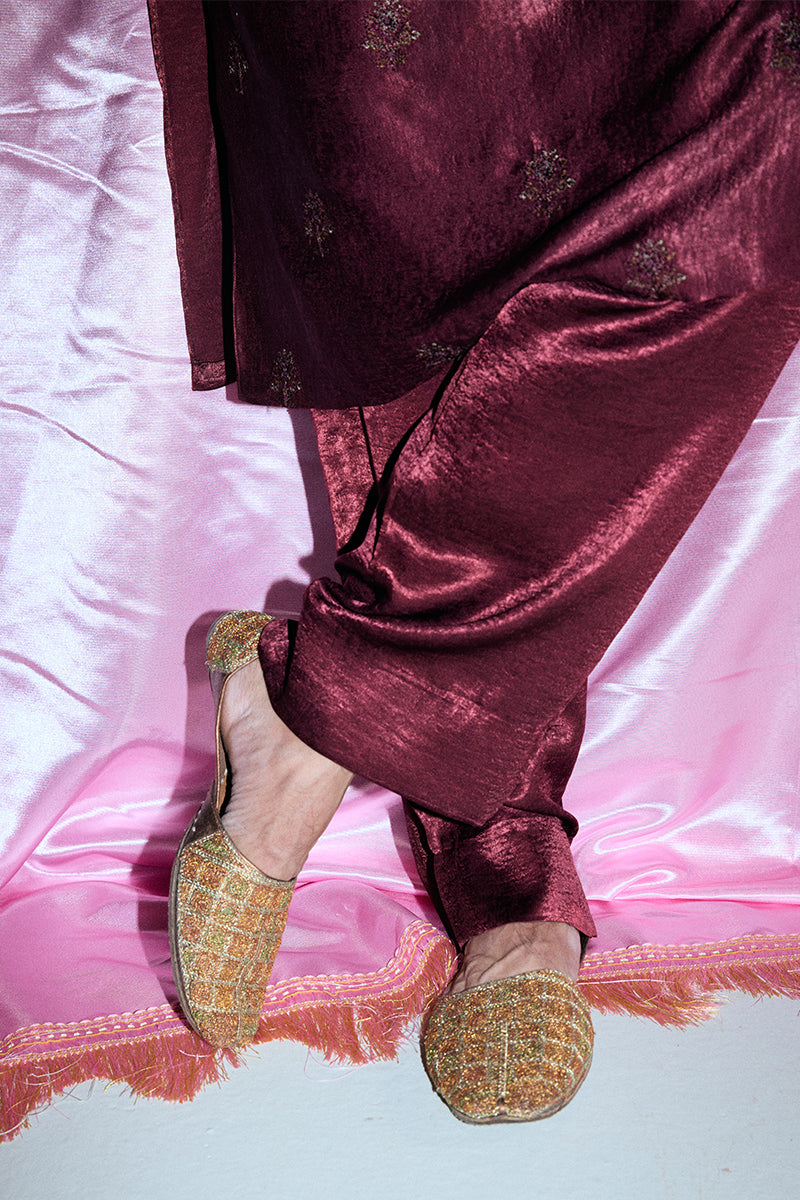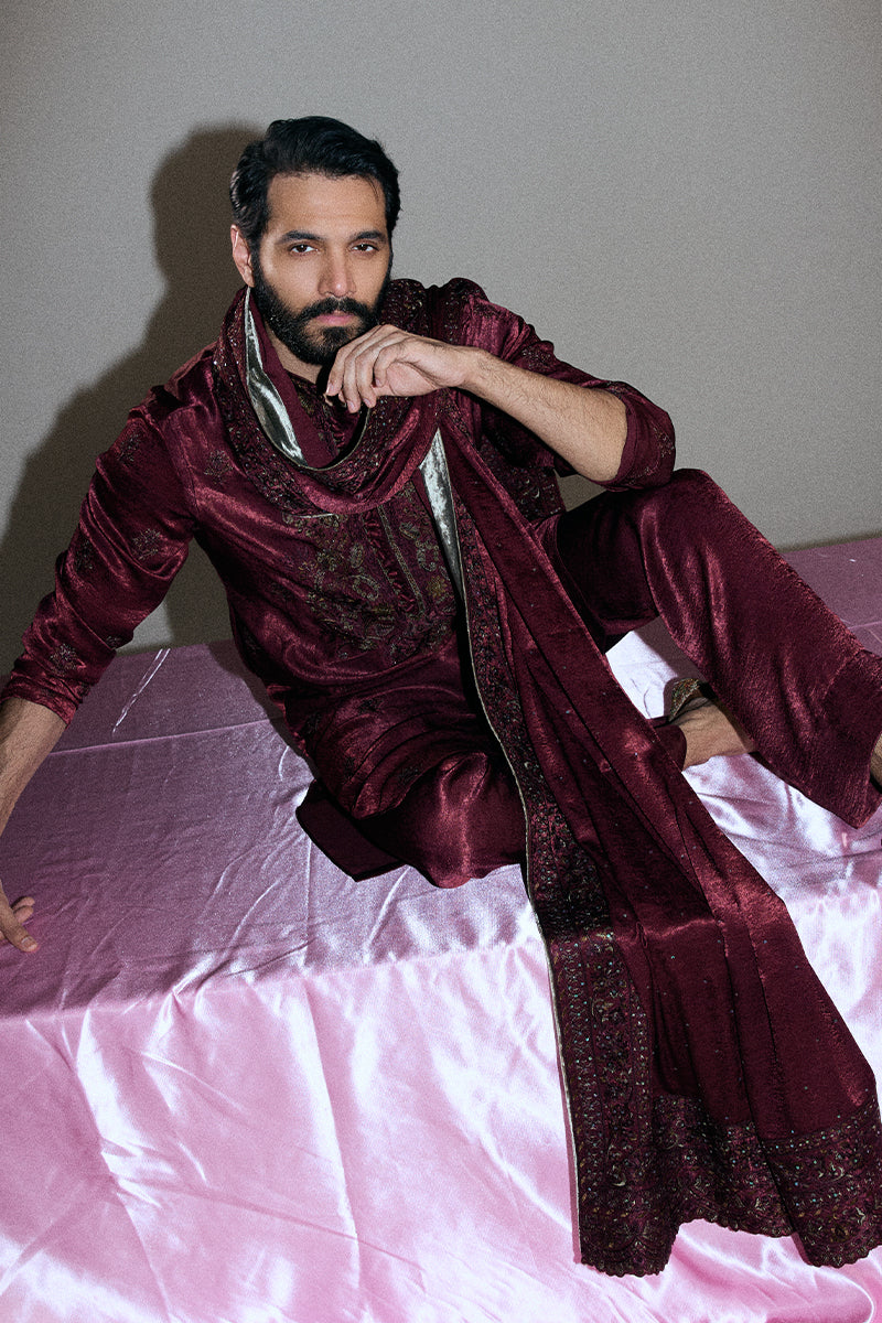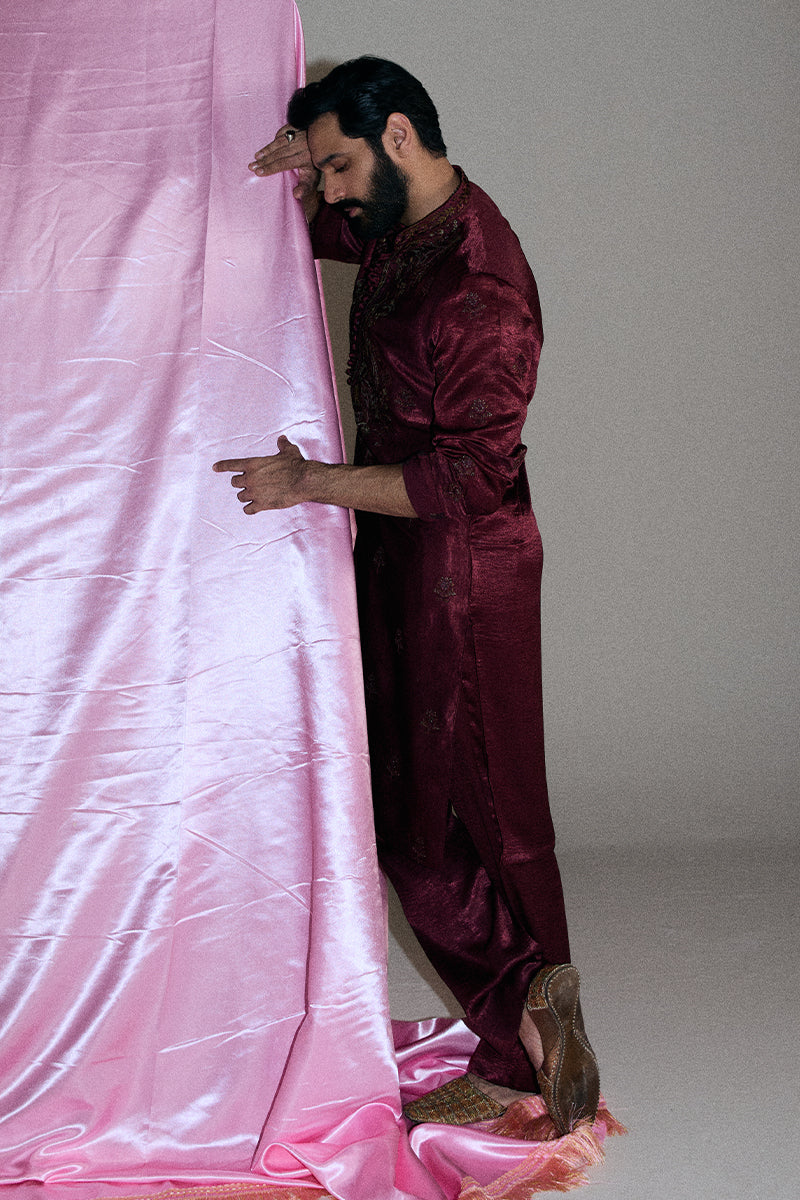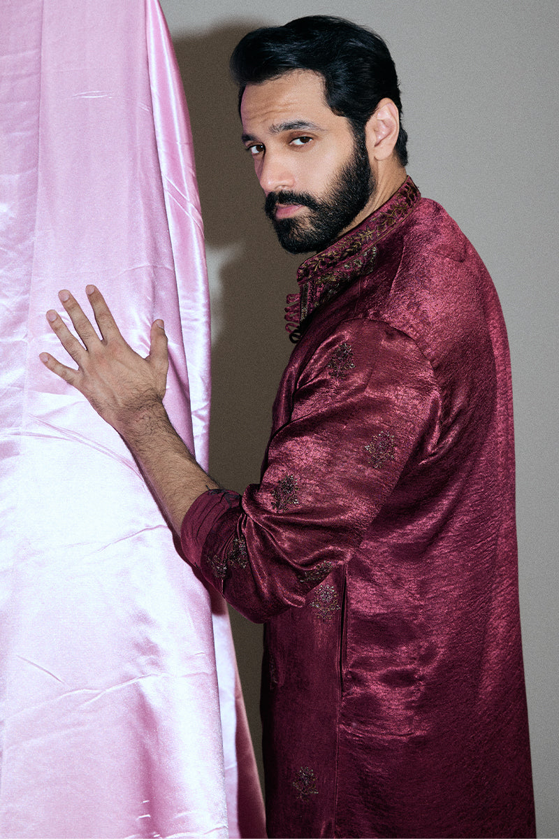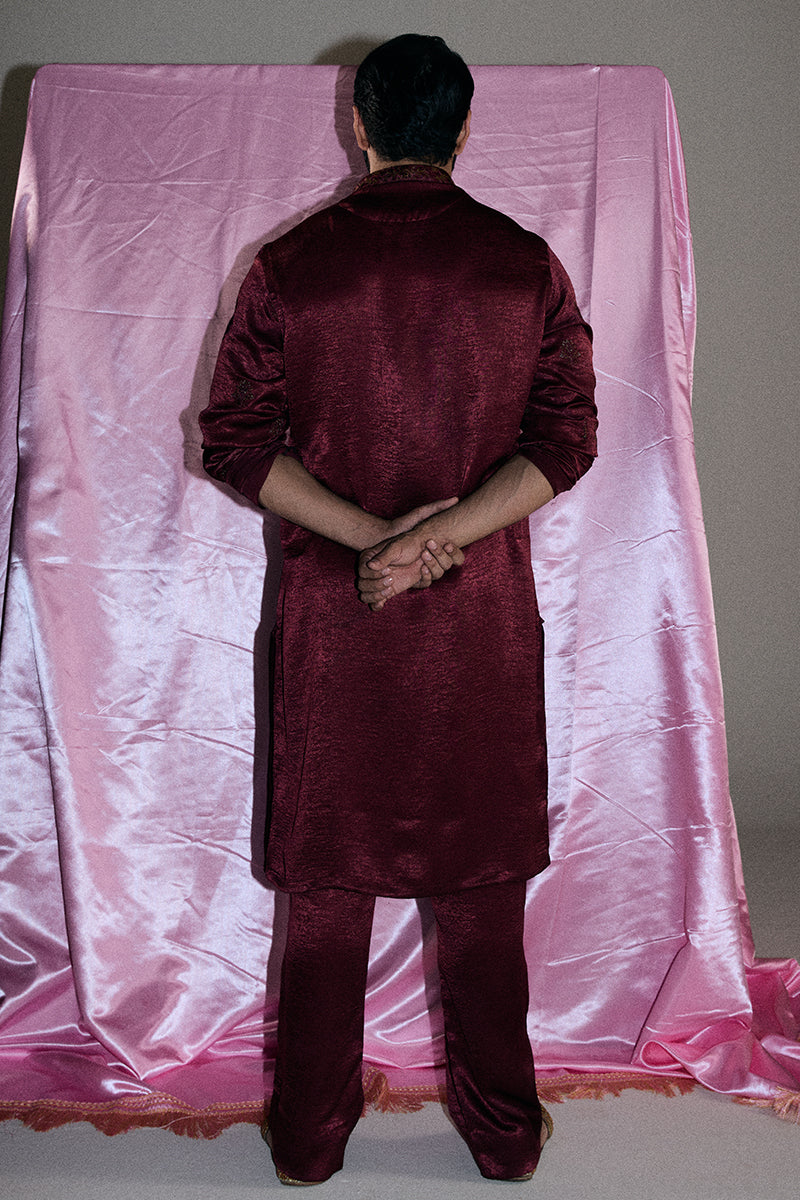 A deep burgundy kurta and pajama set adorned with striking floral embroidered composed neckline and all-over booti chatta accented with shimmering sequins, exuding opulence and refined elegance.