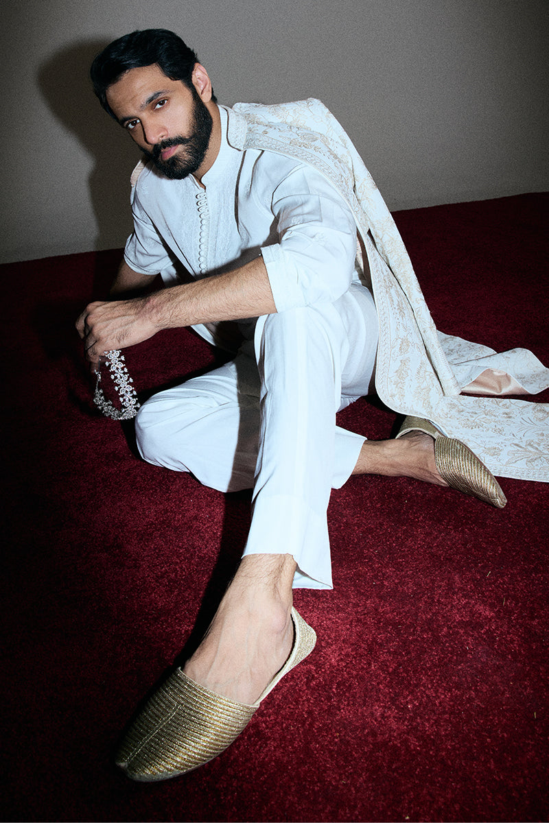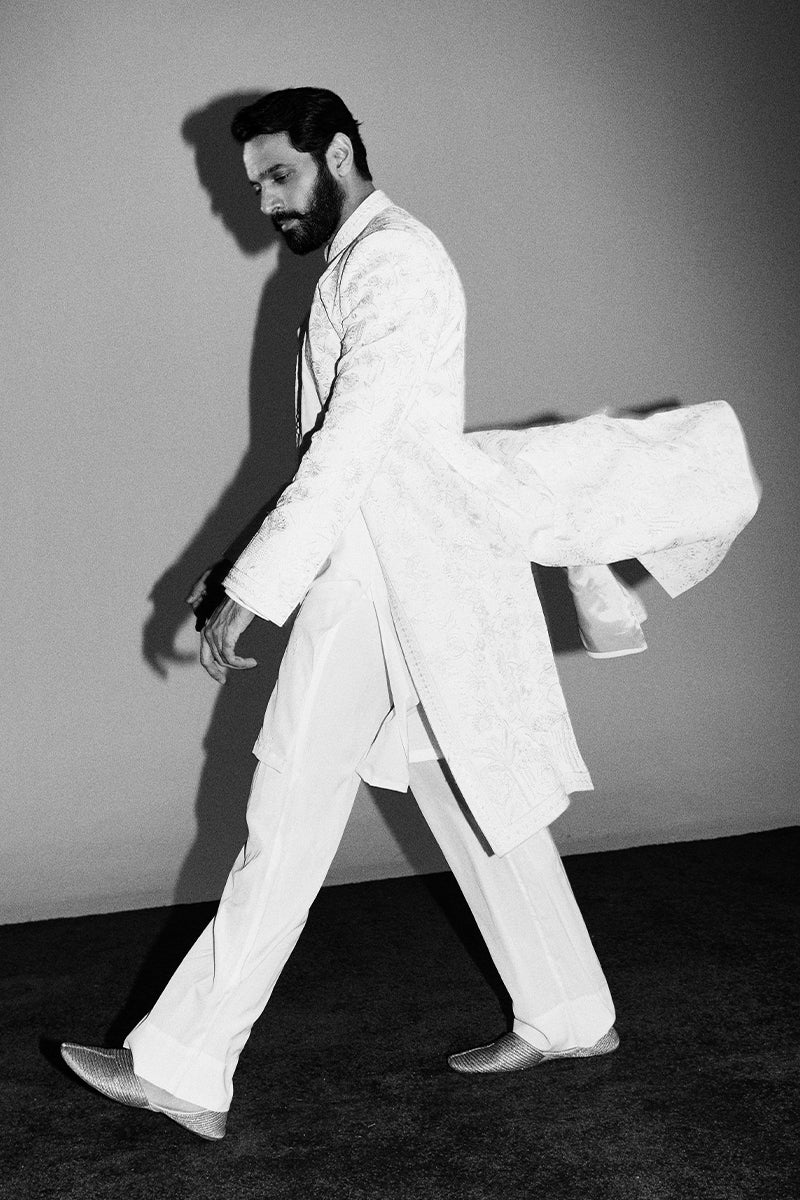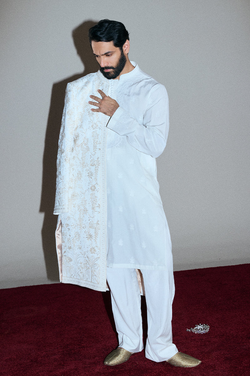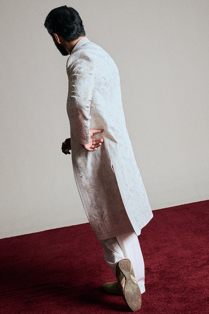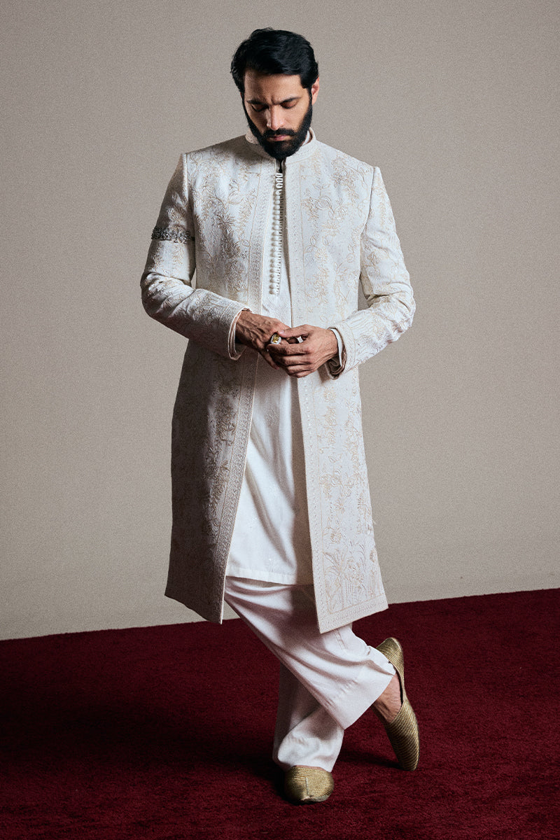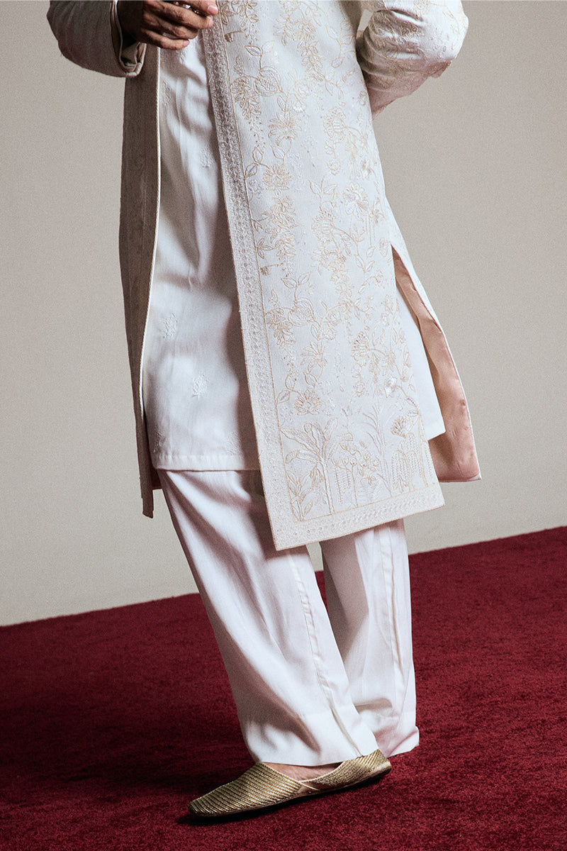 Crafted in crushed textured fabric, this ivory white embroidered sherwani features a composed embroidered pattern on band and hem. Detailed with intricate gold tilla dori and sequin work, it exudes refined elegance and sophistication.