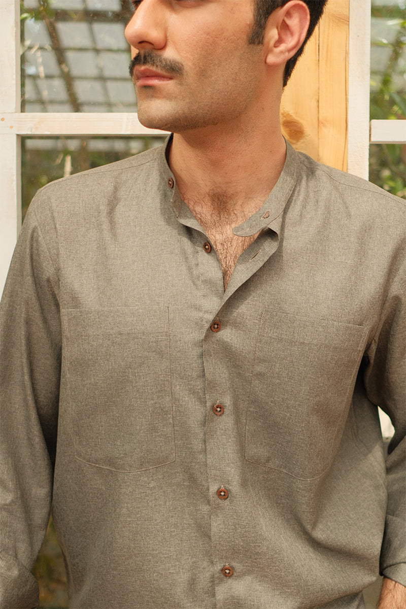 Ash gray linen textured shirt, with extended loop band collar and wooden buttons.