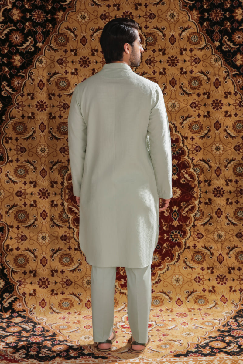 A mint green, cotton kurta comes with a hidden placket and wooden buttons with a round shirt bottom. Paired with matched dyed cotton trousers.