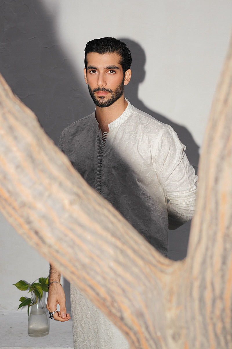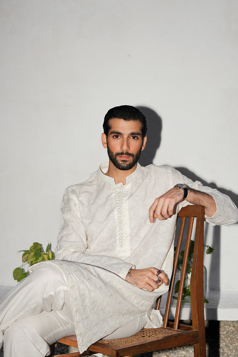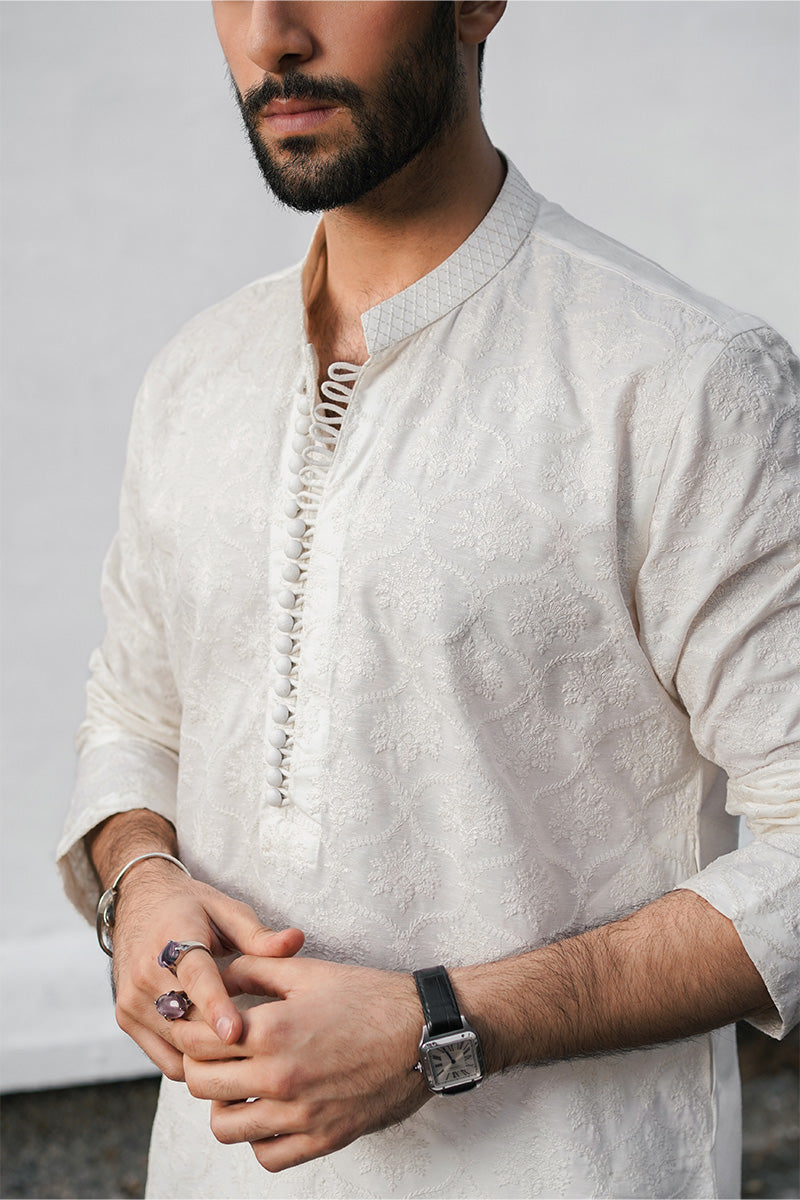 Pearl white slub cotton kurta and pajama set, with floral embroidered patterns, detailed with top-stitch band collar and loop button closures.