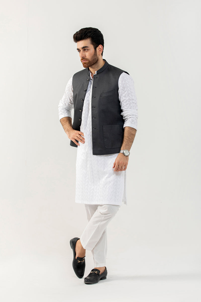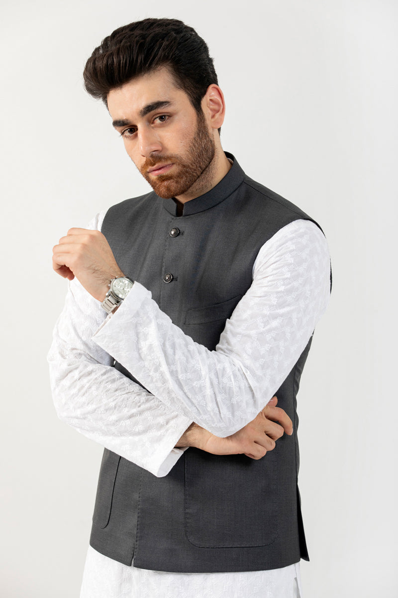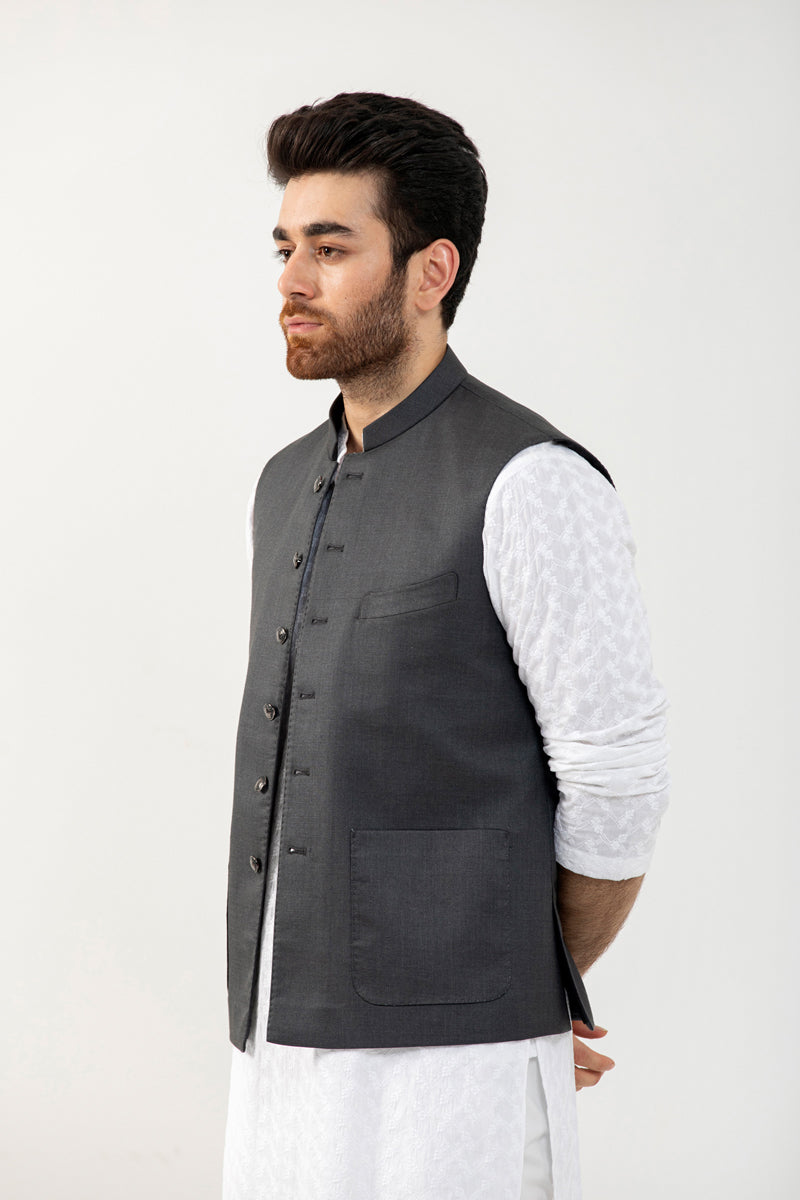 CHARCOAL GREY TROPICAL SUITING FABRIC WAIST COAT WITH GREY MATALLIC BUTTONS AND PATCH POCKETS