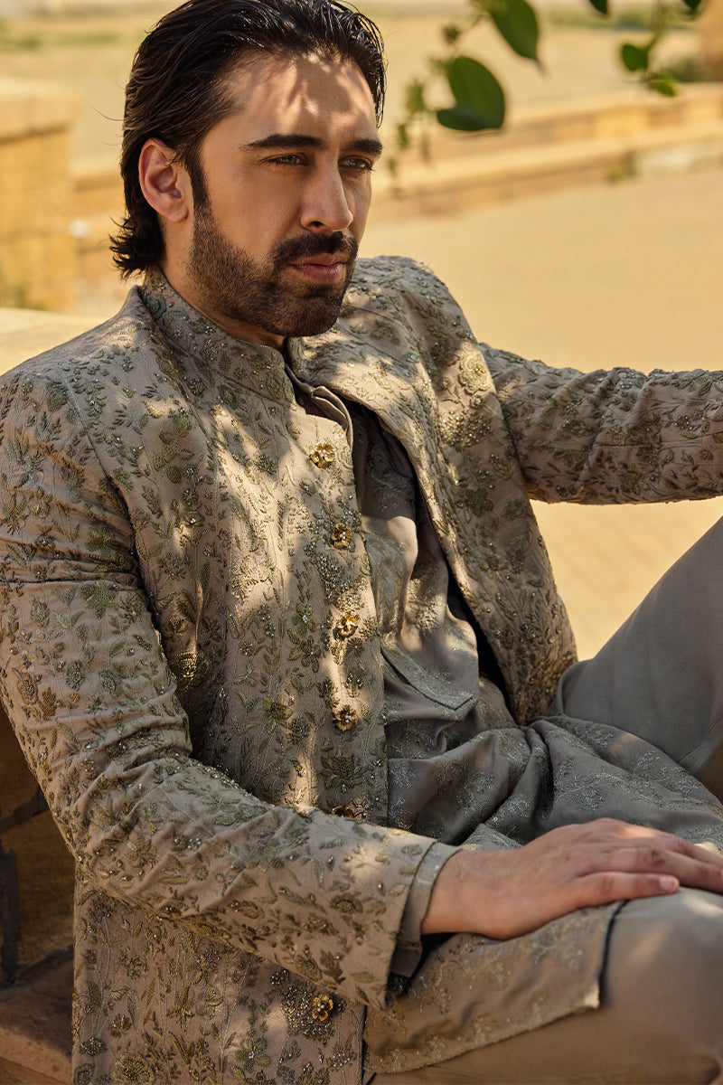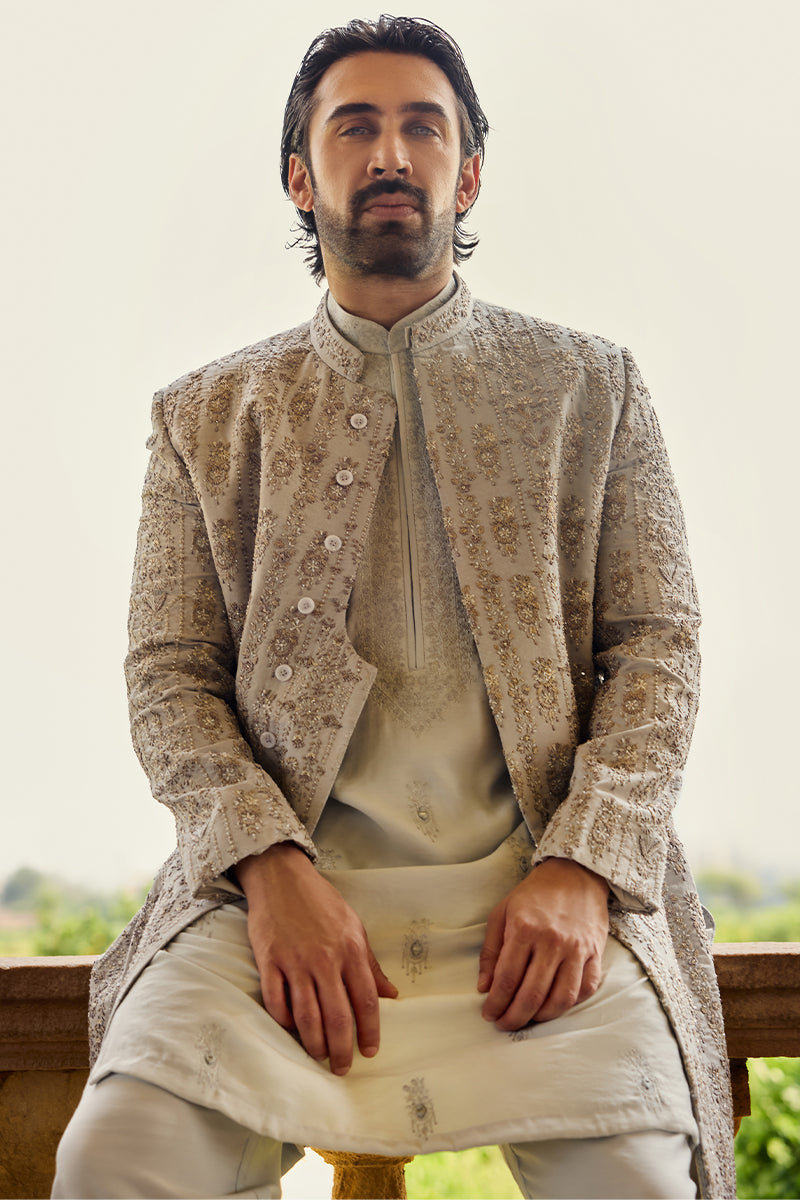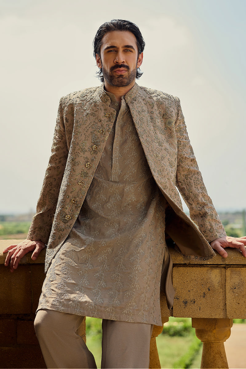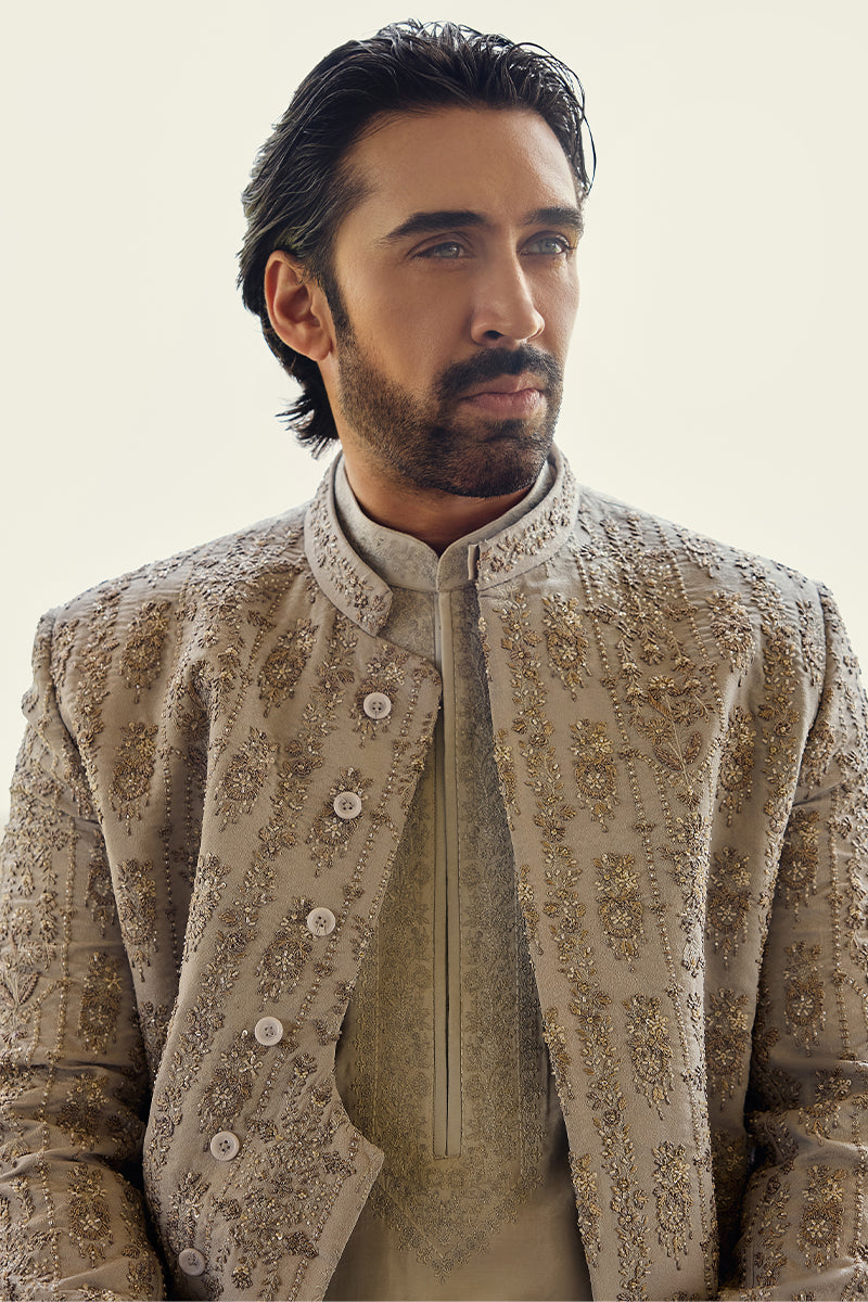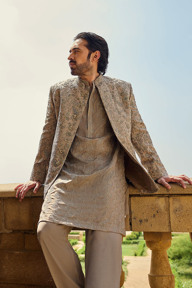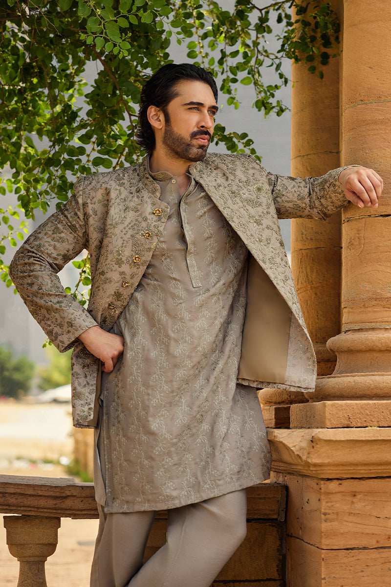 A subtle, muted olive green jacquard bandhgala jacket paired with embroidered kurta and pajama, featuring intricate resham and metallic thread embroidered pattern enhanced with traditional tilla work and delicate French knots. Detailed with nature-inspired floral embroidered patterns and metallic custom floral buttons.