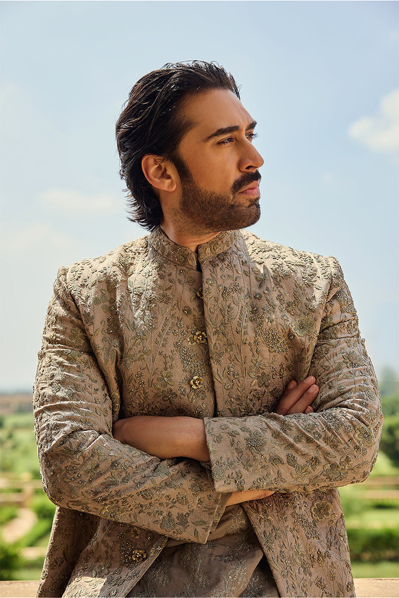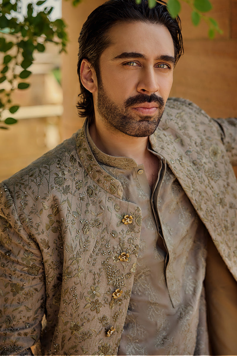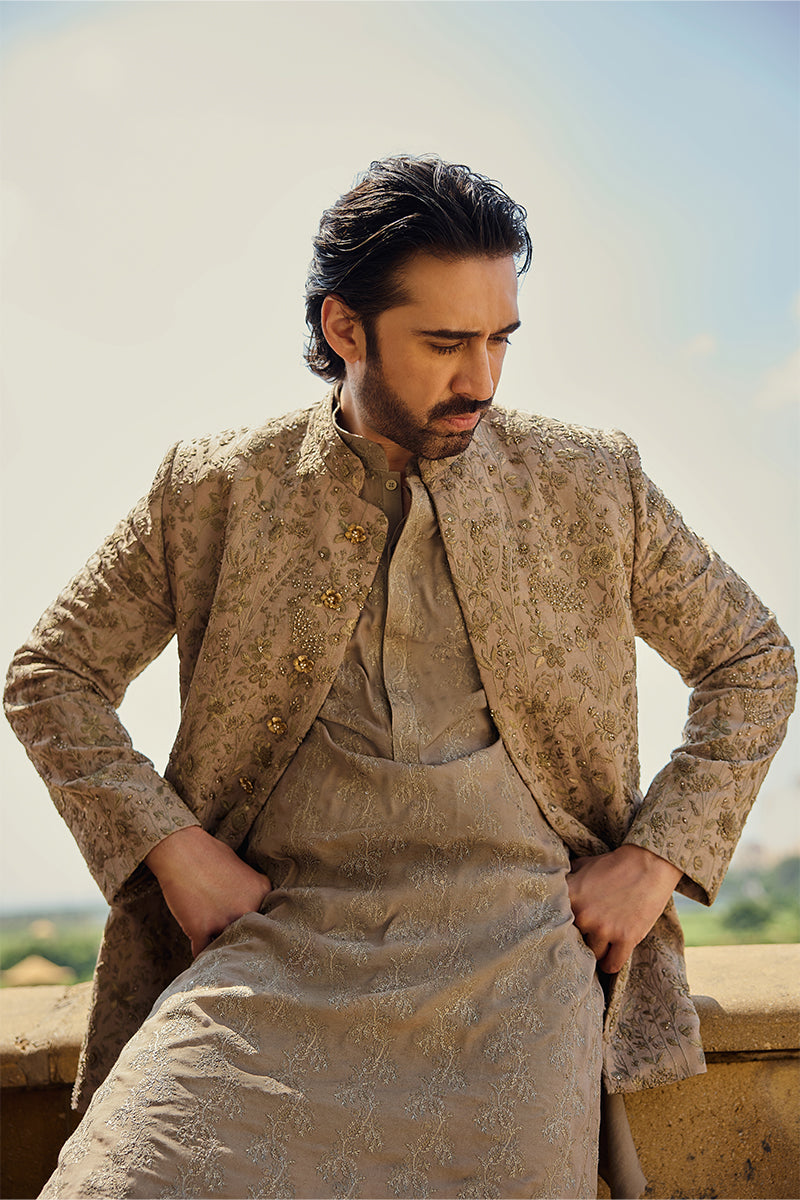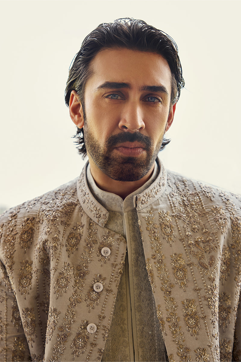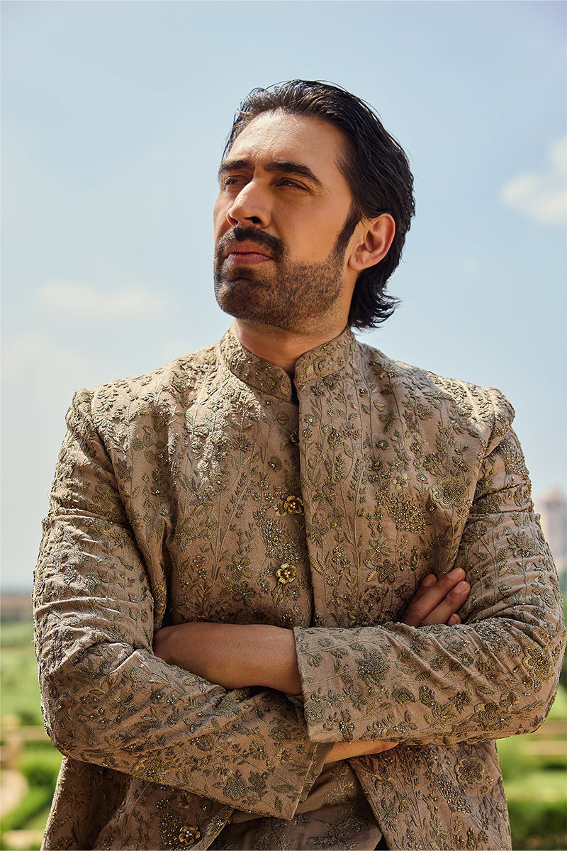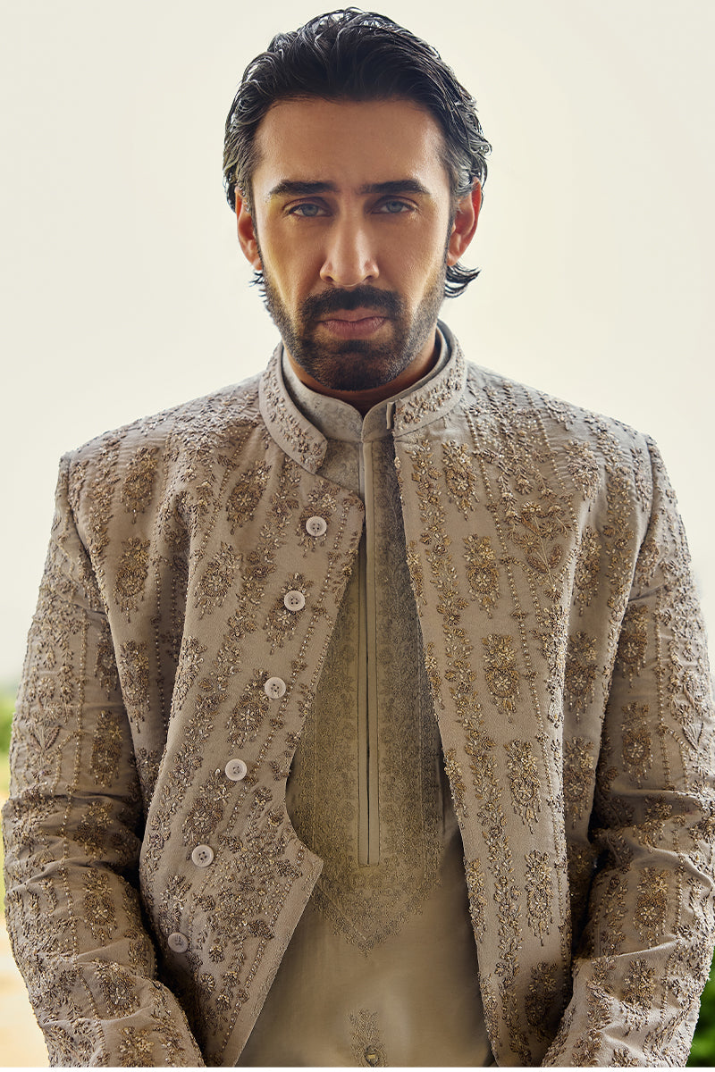 A subtle, muted olive green jacquard bandhgala jacket paired with embroidered kurta and pajama, featuring intricate resham and metallic thread embroidered pattern enhanced with traditional tilla work and delicate French knots. Detailed with nature-inspired floral embroidered patterns and metallic custom floral buttons.