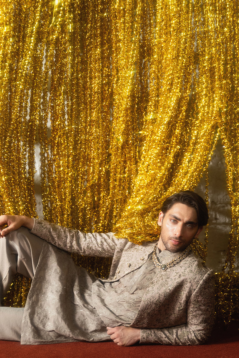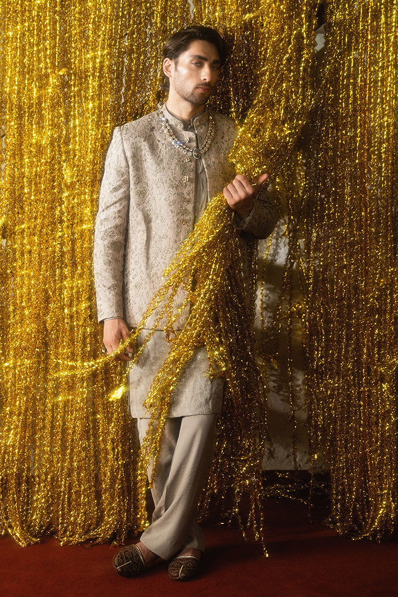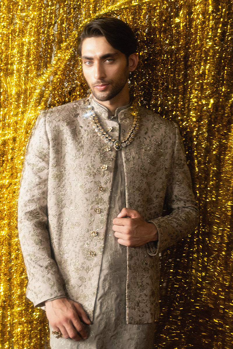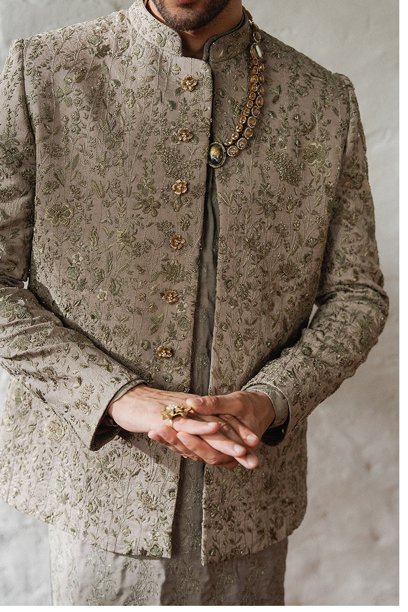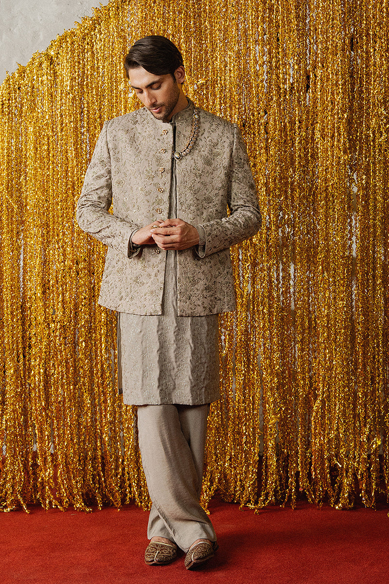 A subtle, muted olive green jacquard bandhgala jacket paired with embroidered kurta and pajama, featuring intricate resham and metallic thread embroidered pattern enhanced with traditional tilla work and delicate French knots. Detailed with nature-inspired floral embroidered patterns and metallic custom floral buttons.