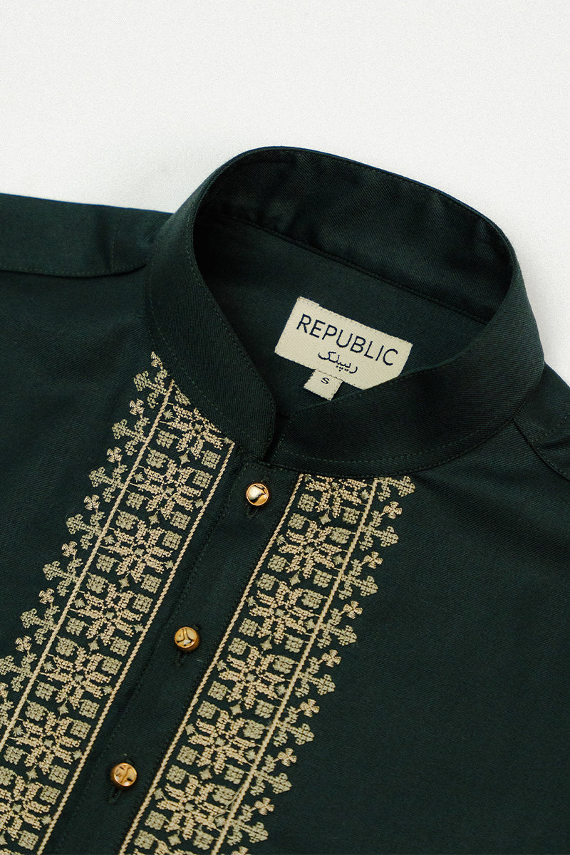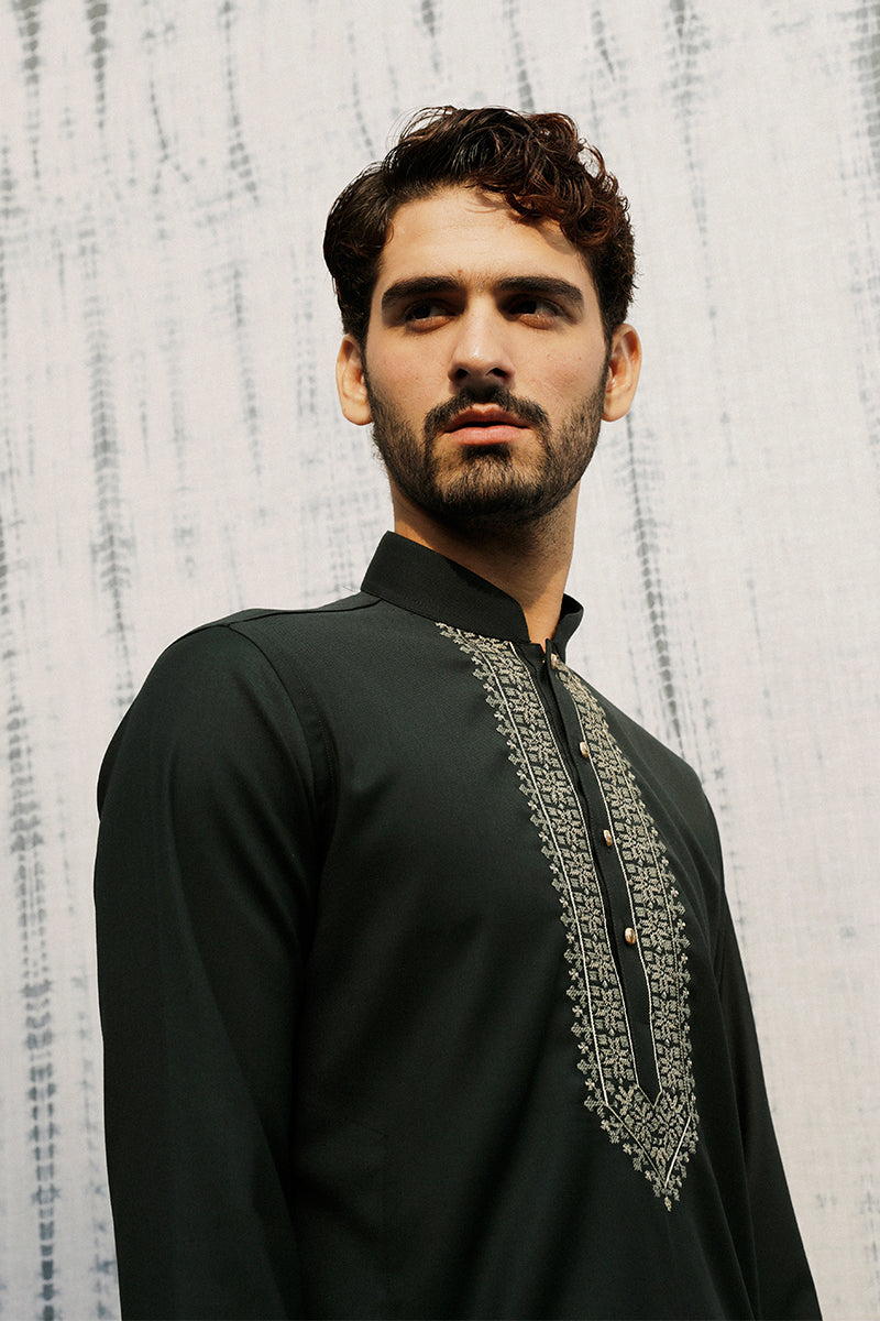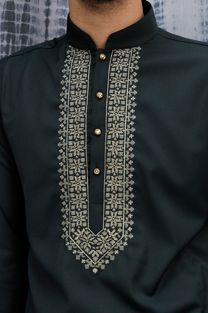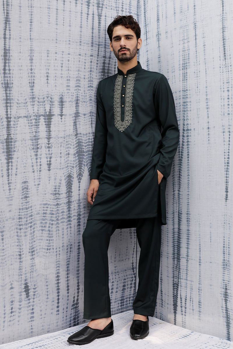 Green kurta pajama adorned with a contrast cross-stitch tribal neckline. Embellished with intricately detailed buttons.