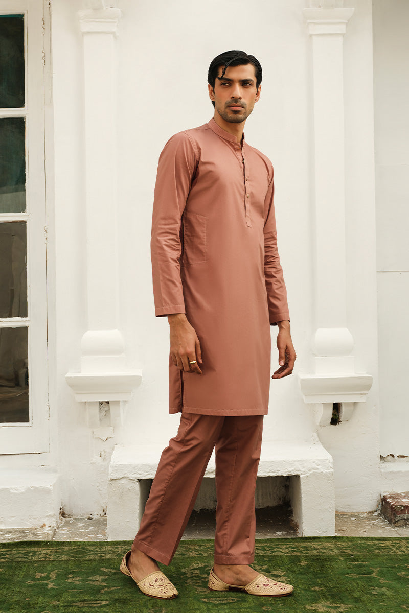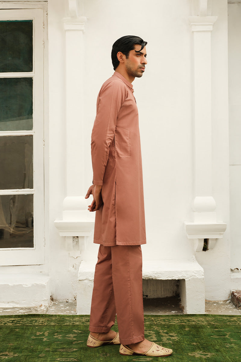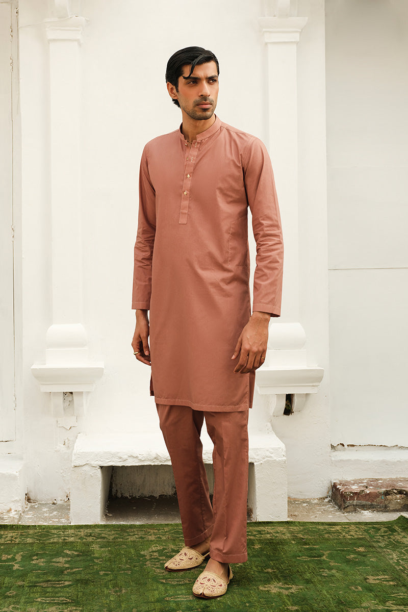 Brick red kurta and pajama set, with box cut band collar and metallic button closures.