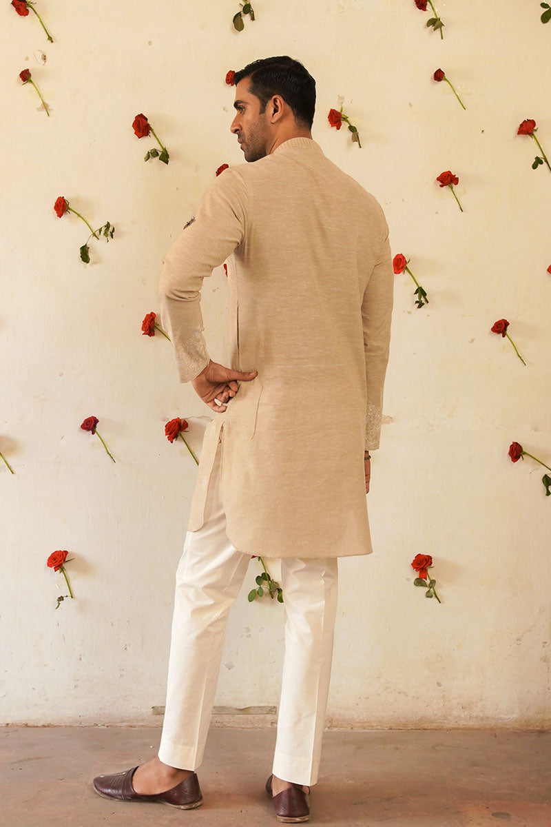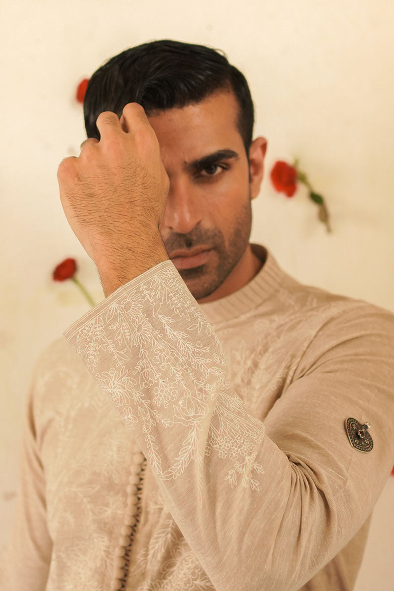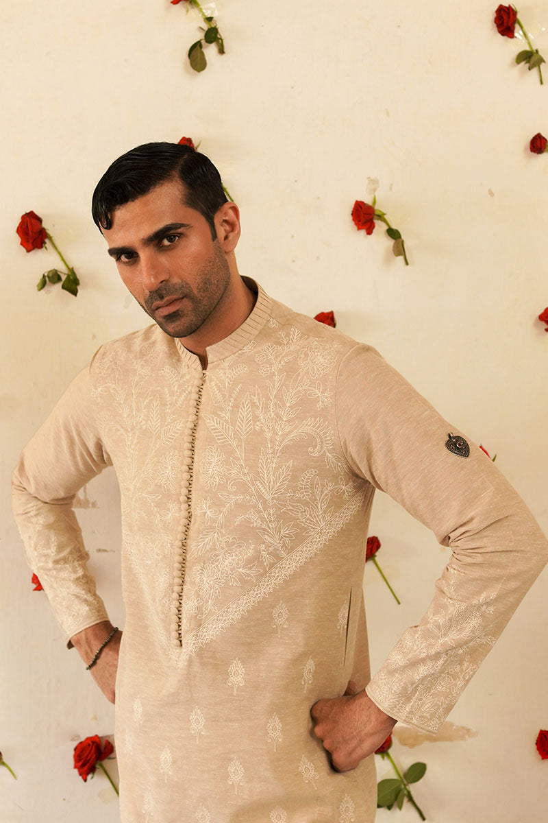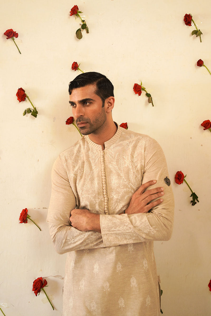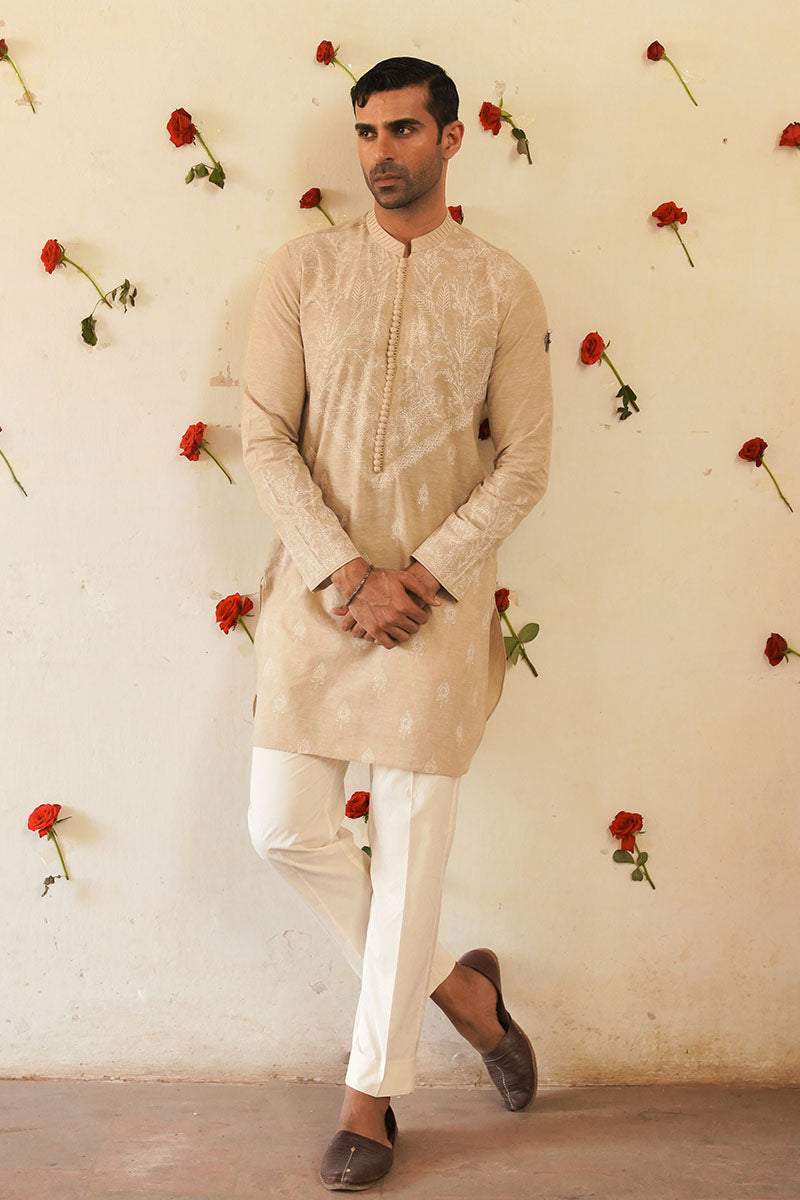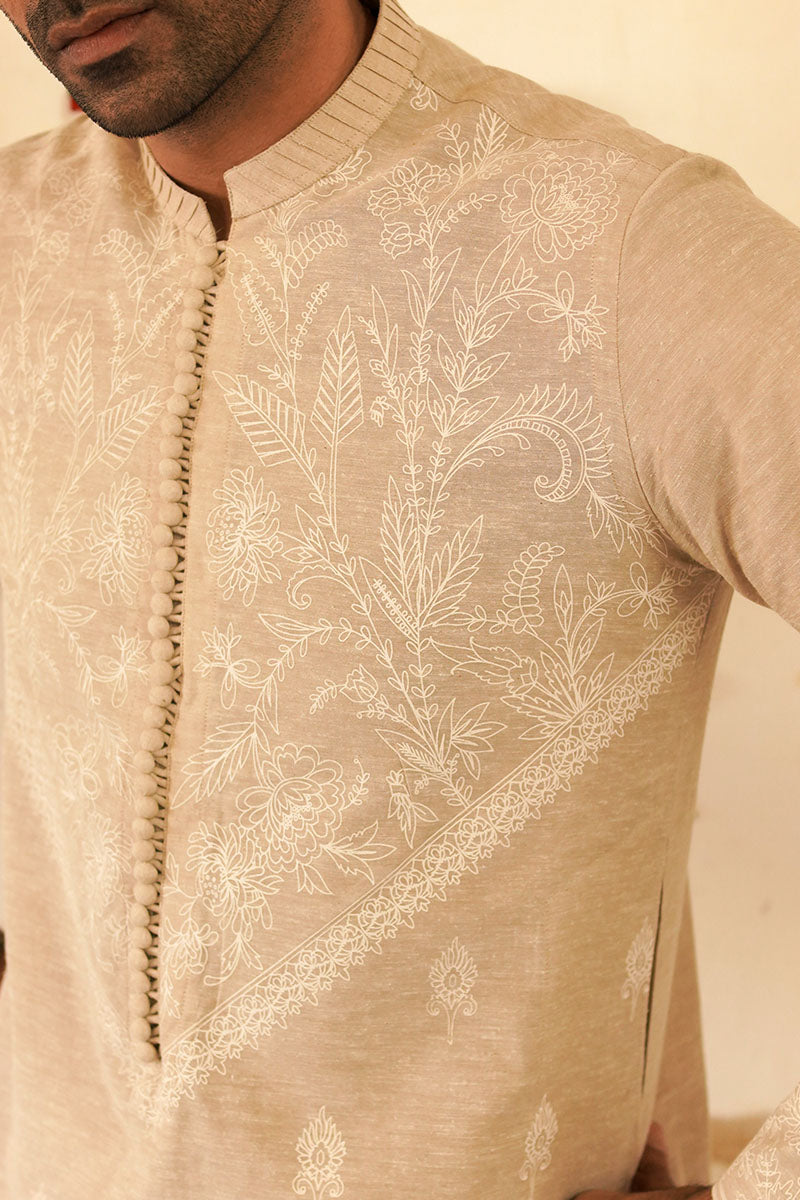 Beige slub cotton screen printed cotton kurta, with mid-century floral motifs and loop button closure.
