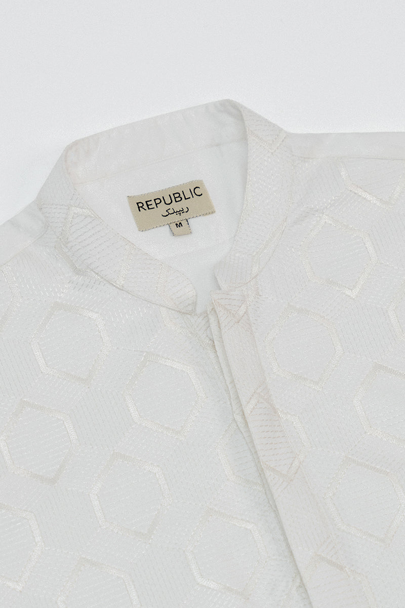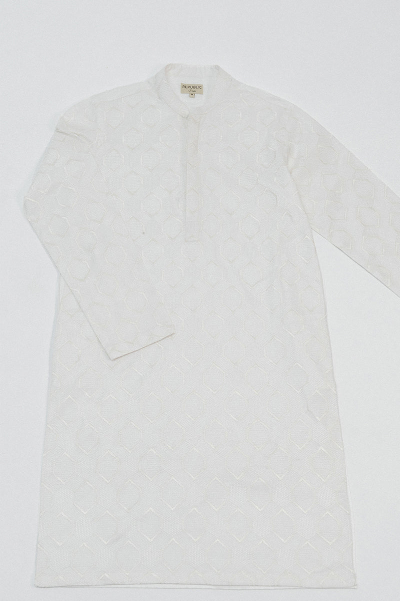 White kurta pajama set in a winter cotton fabric with single stitch hexagon embroidery pattern work all over the kurta.
