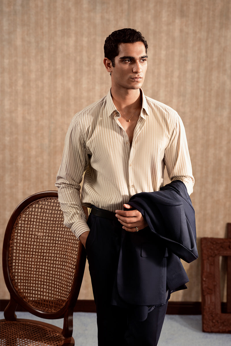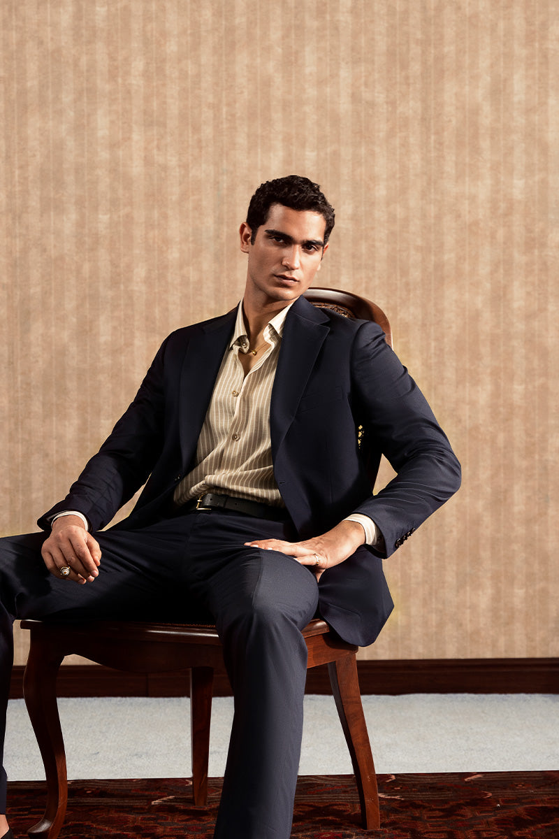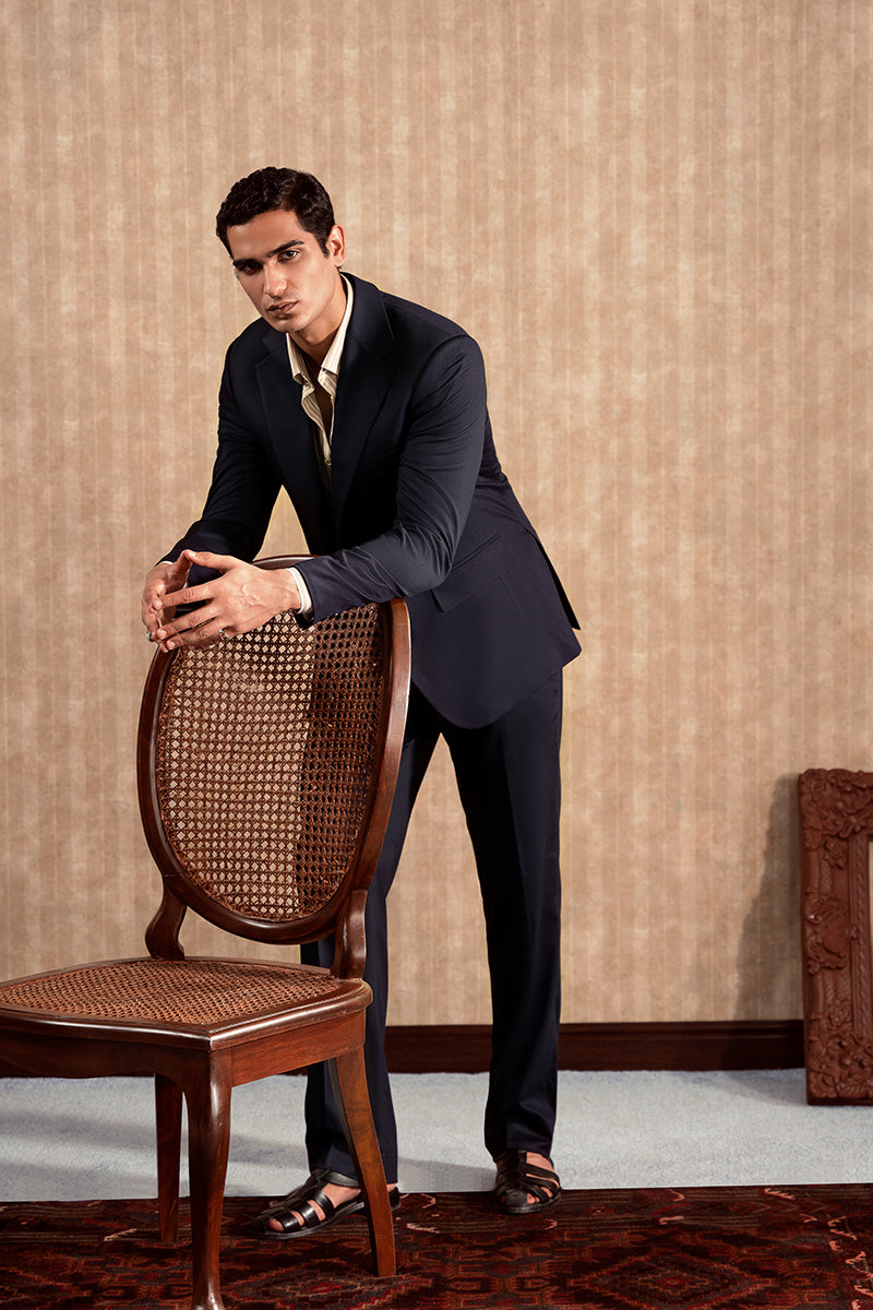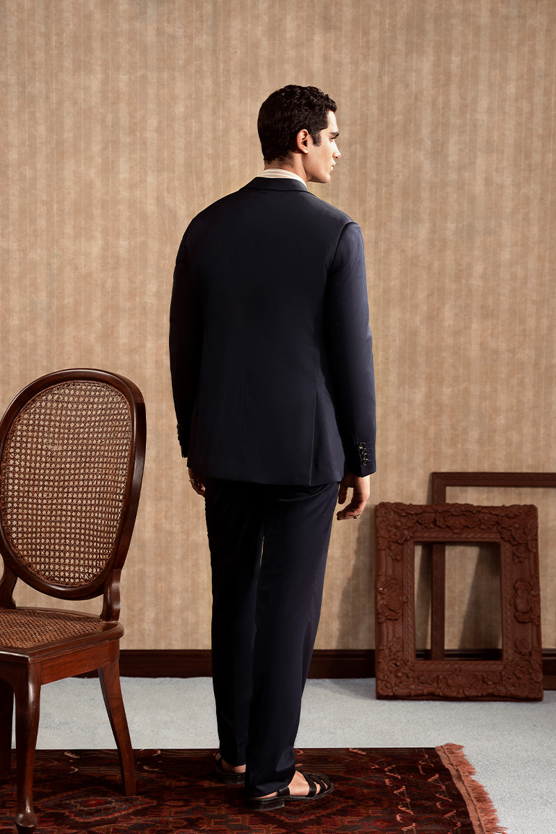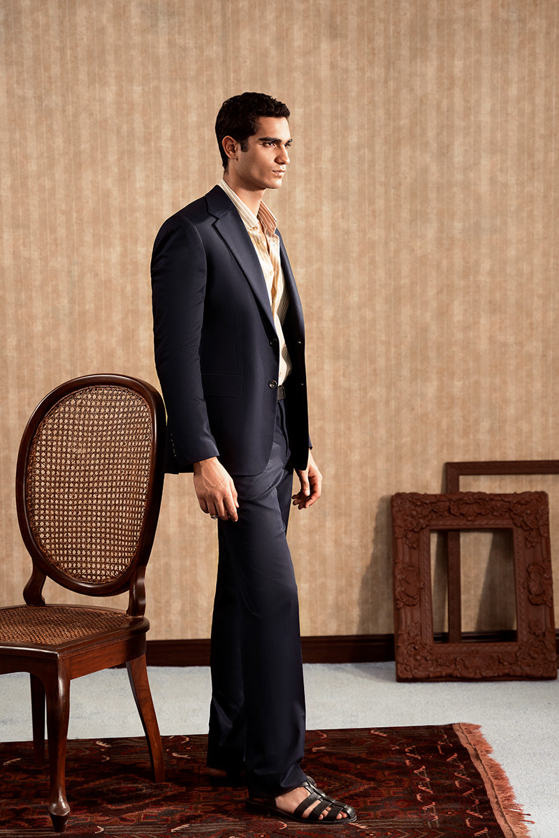 Blue single breasted linen suit detailed with a notch collar paired with straight tailored pants.