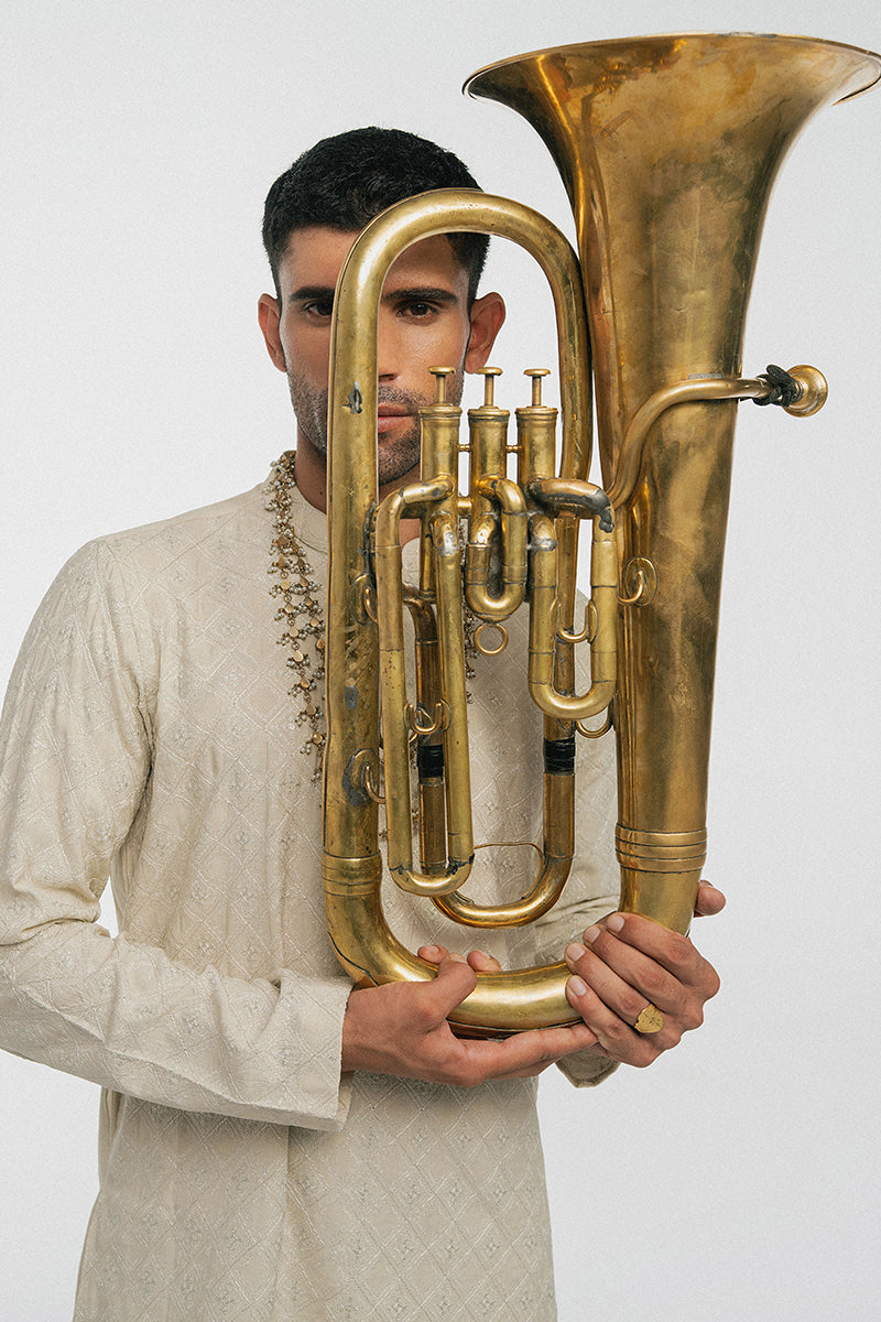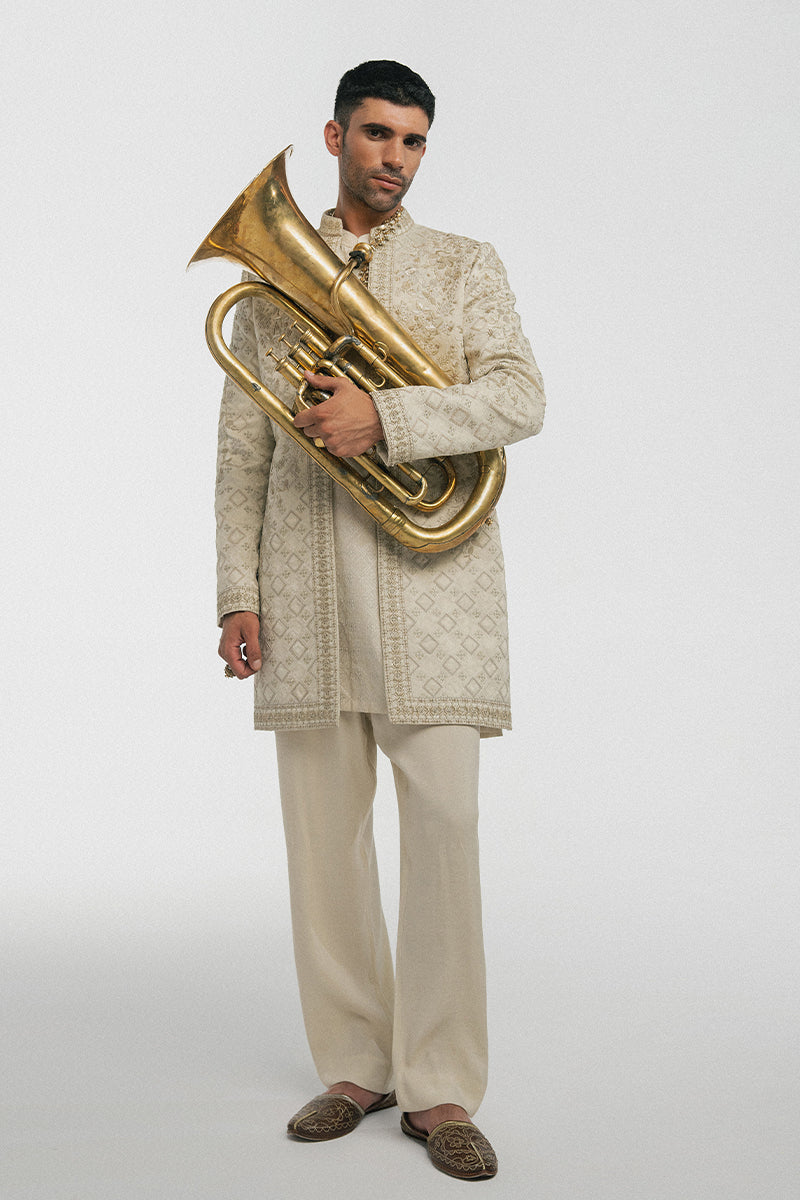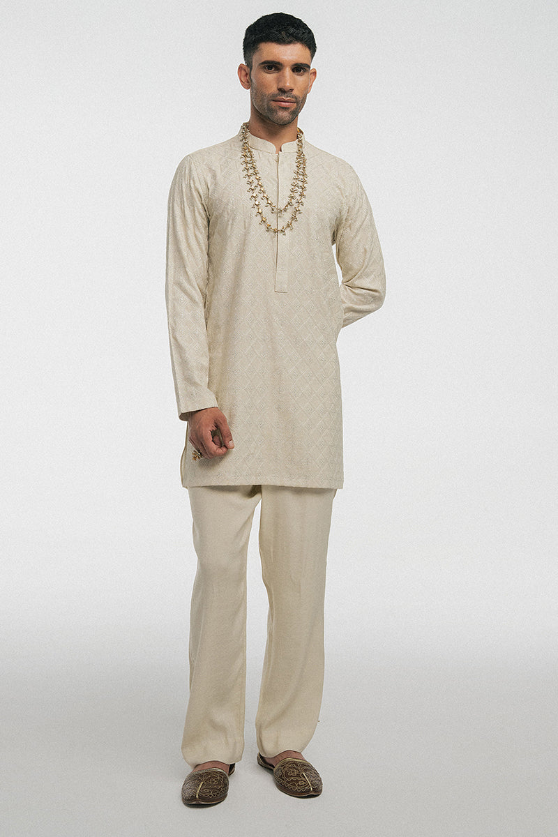 A sand beige embroidered kurta pajama set featuring intricate geometric and floral motifs. Detailed with kora, tilla and resham.
