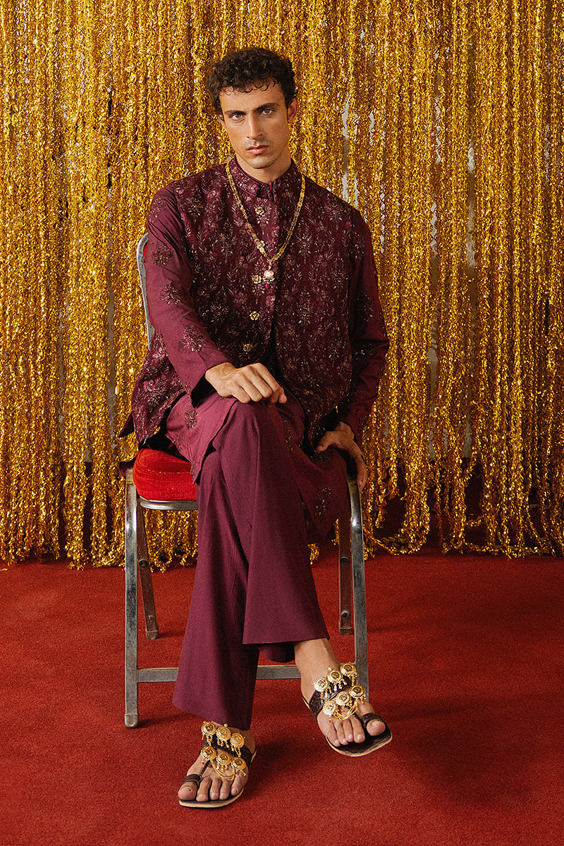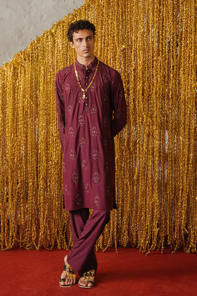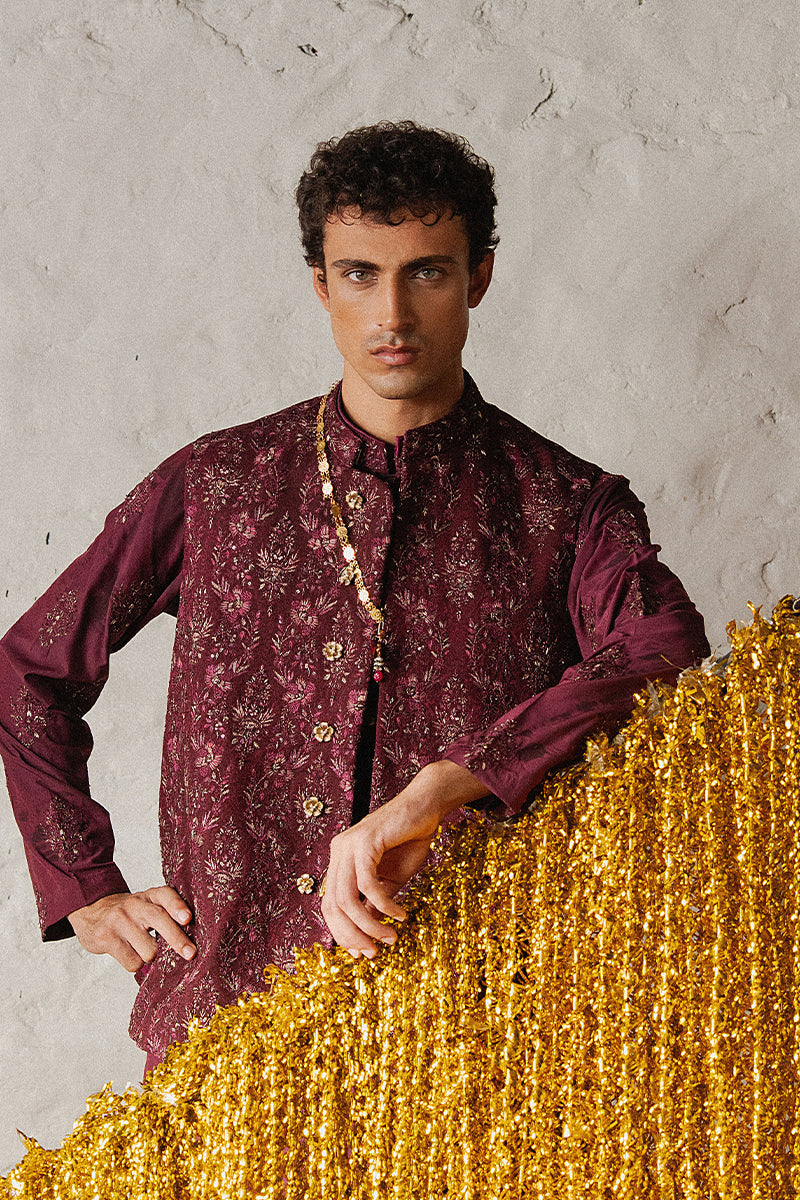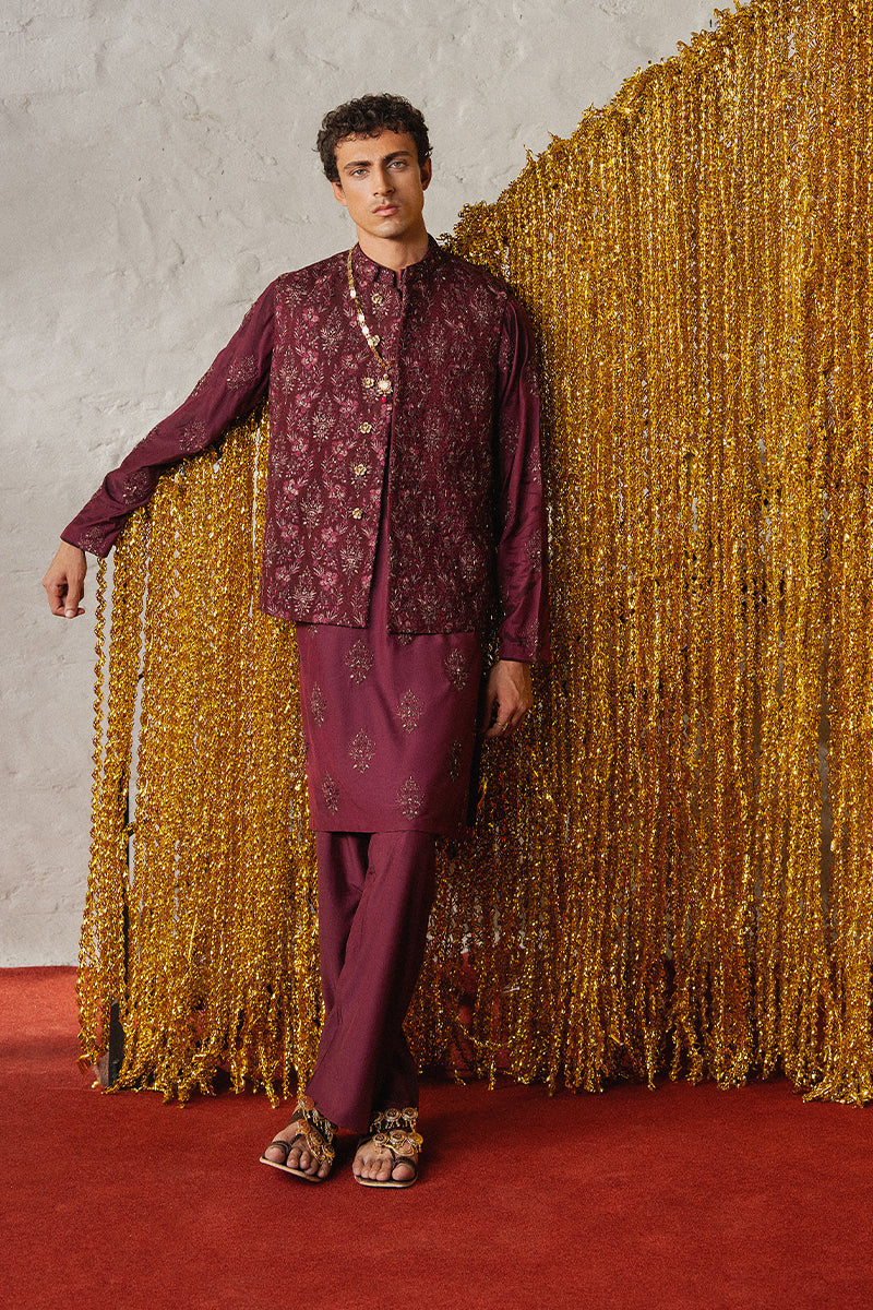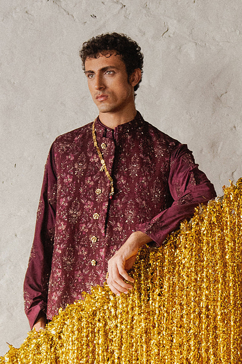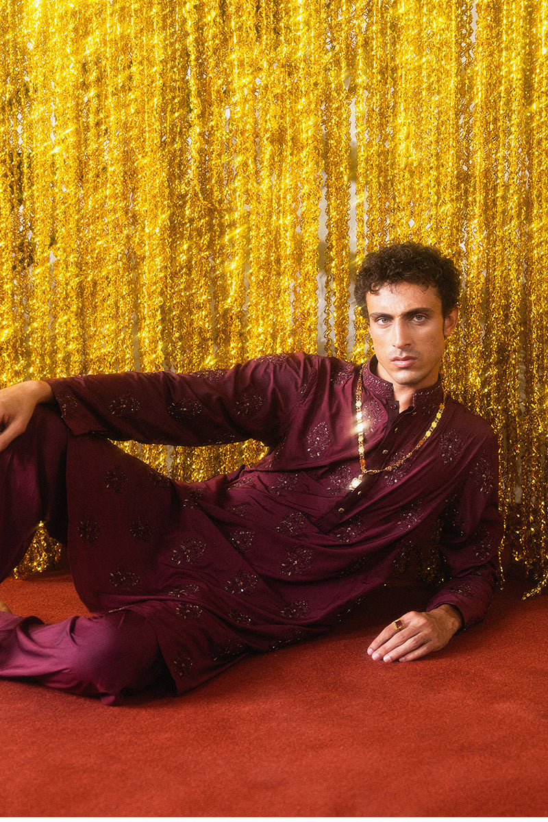 A deep burgundy kurta pajama set, embroidered patterns on satin silk. Delicate zardozi work and fine resham threadwork exuding regal charm and festive elegance.