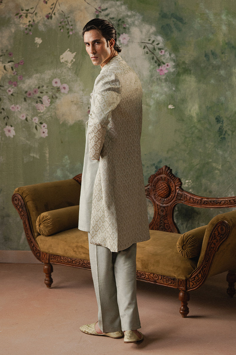 Sage green embroidered sherwani adorned with all-over cross-stitch geometric pattern, crafted from rich Jamawar fabric.