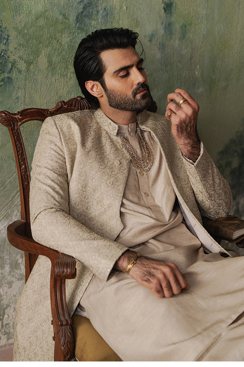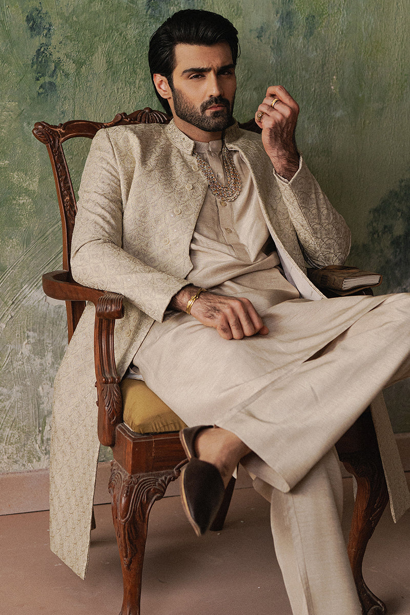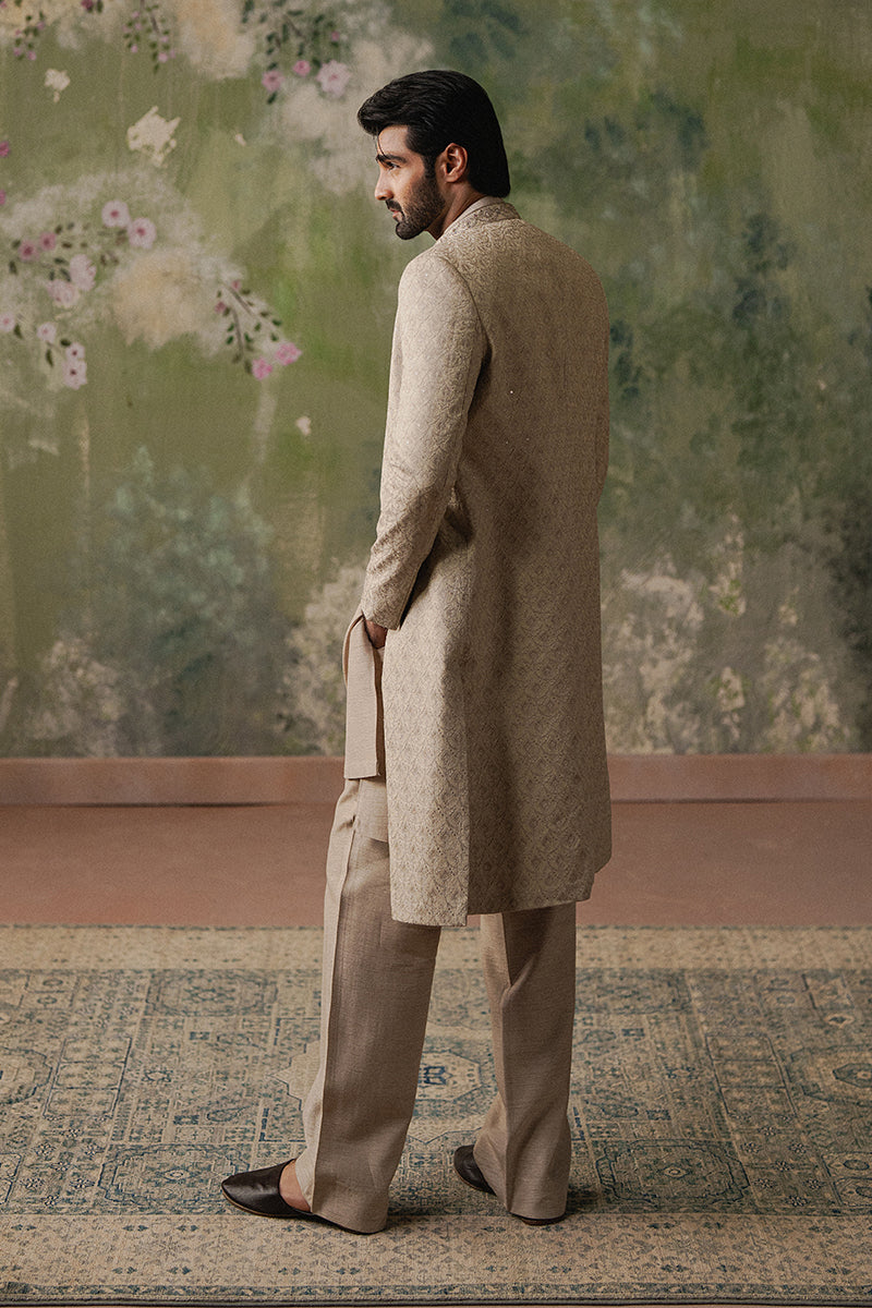 Beige gold jacquard embroidered sherwani, with midcentury floral embroidered patterns in gold and green. Giving it a royal yet elegant look.