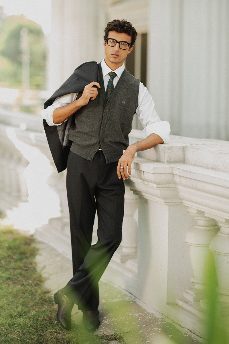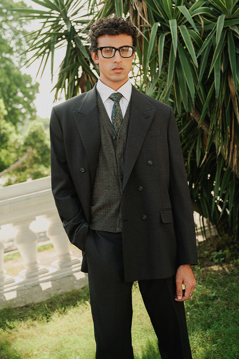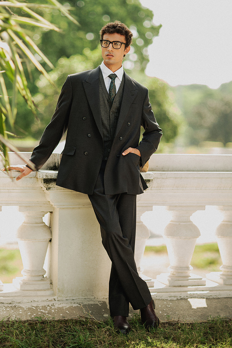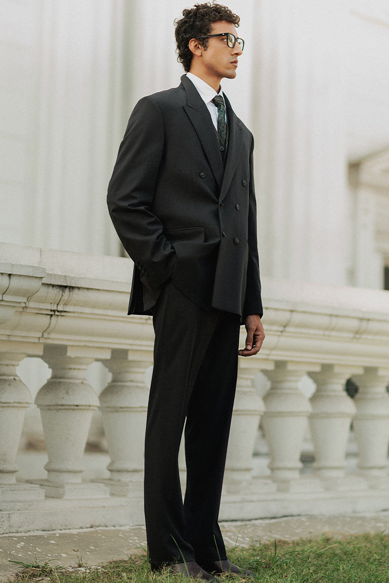 A tailored charcoal grey double-breasted suit in Italian Super 120's suiting fabric with grey hood buttons and classic peak lapel.