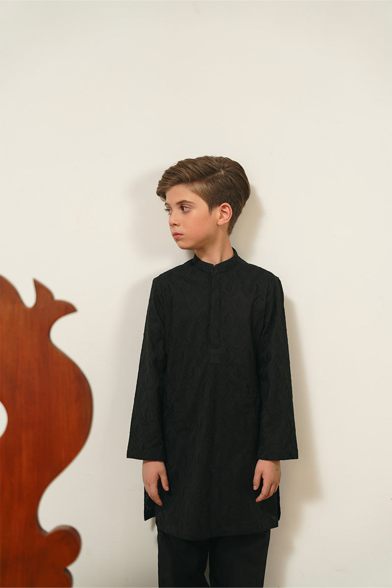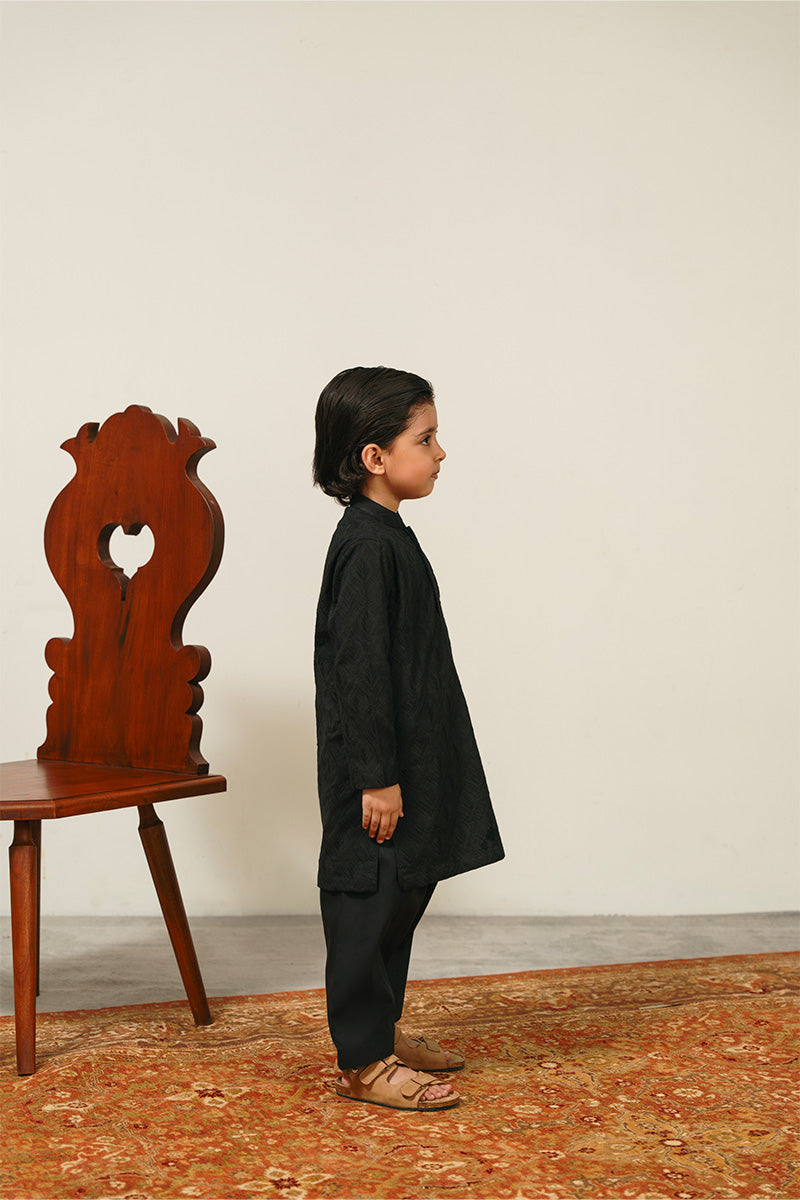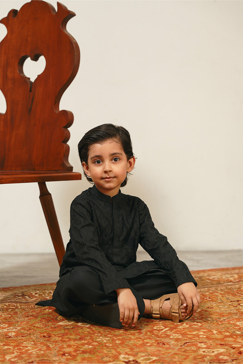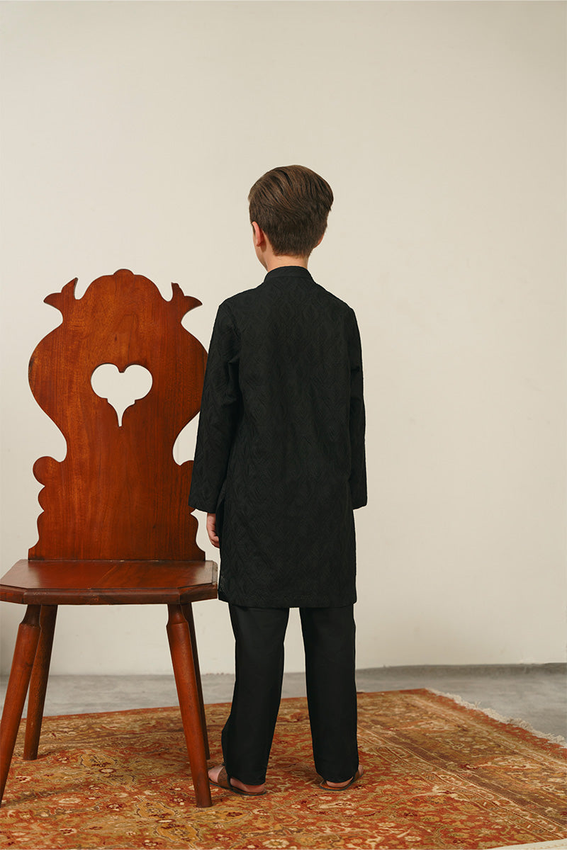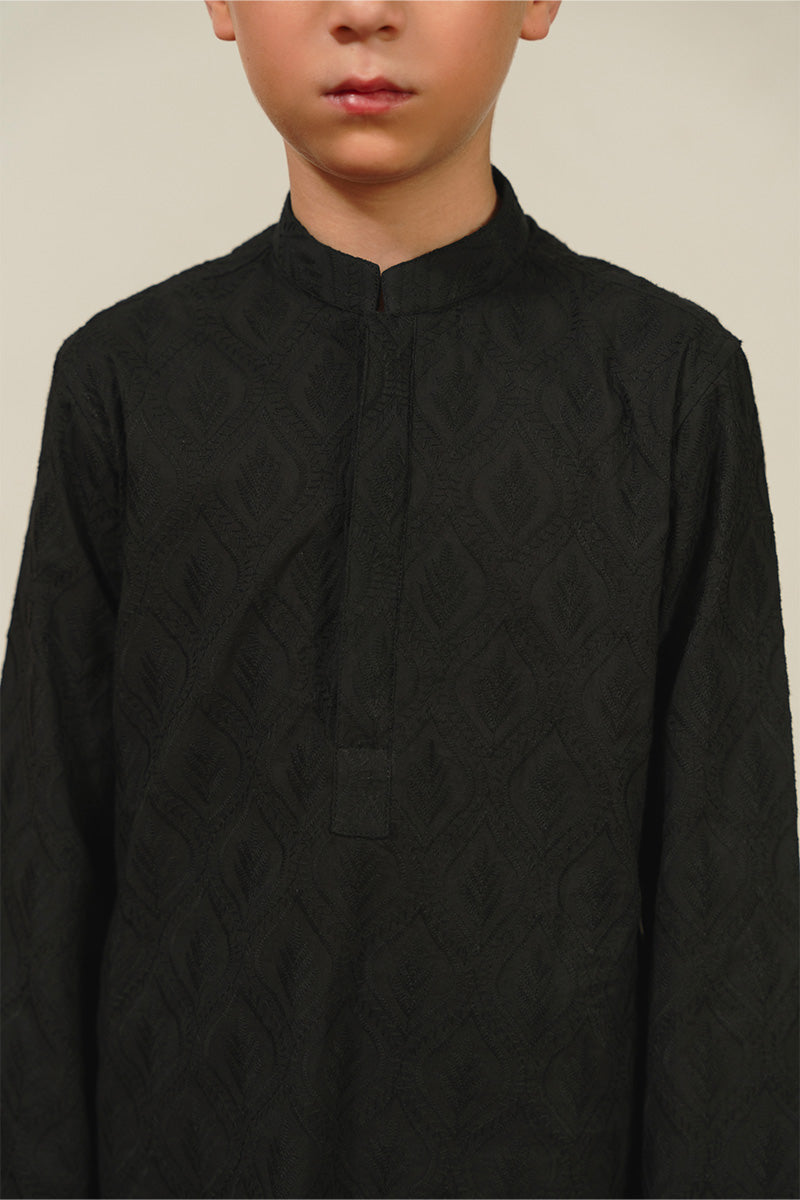 A black kurta in a premium cotton fabric detailed with a ban collar and hidden placket with all over floral and geometric chikankari embroidery.