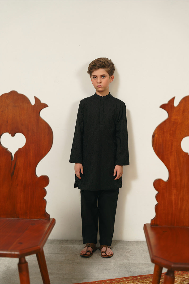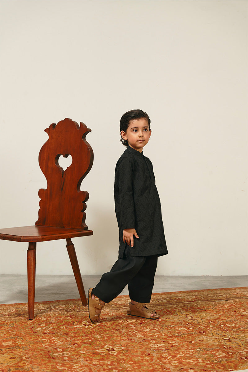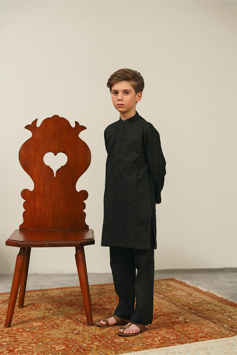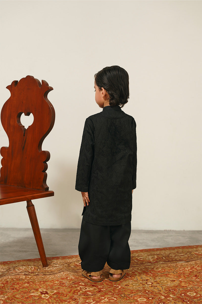 A black kurta in a premium cotton fabric detailed with a ban collar and hidden placket with all over floral and geometric chikankari embroidery.