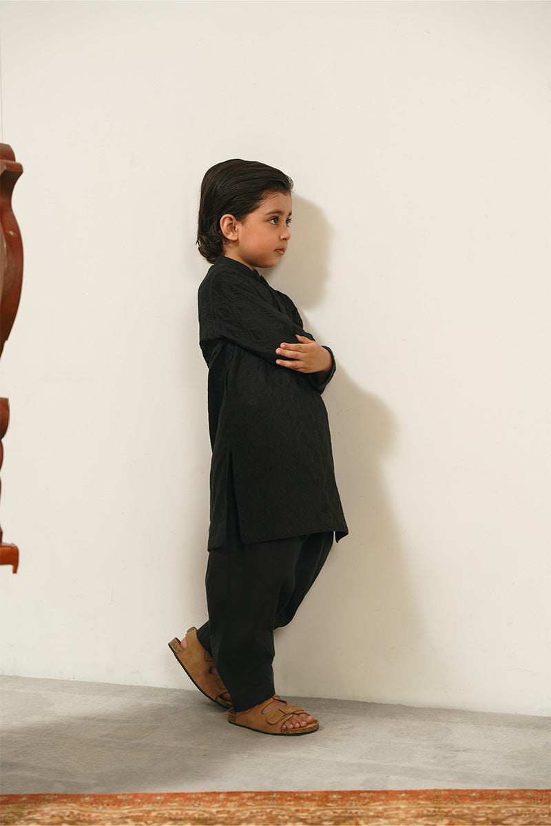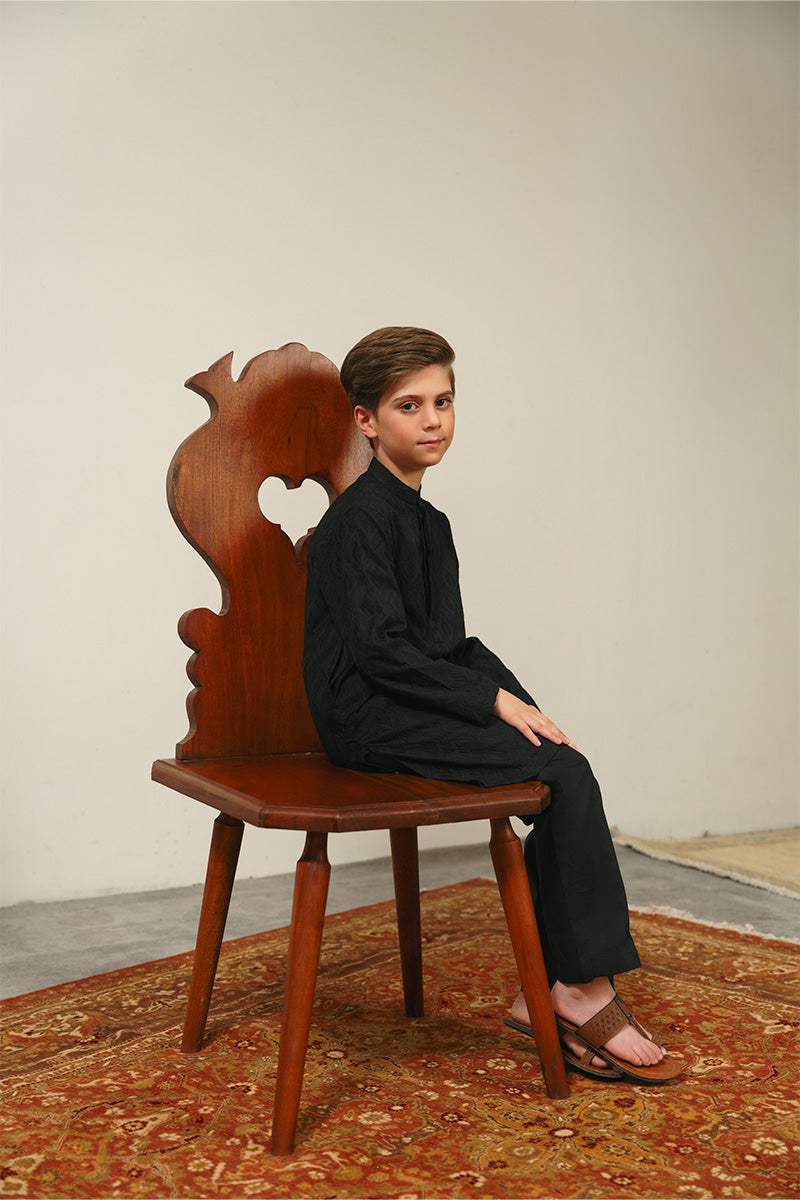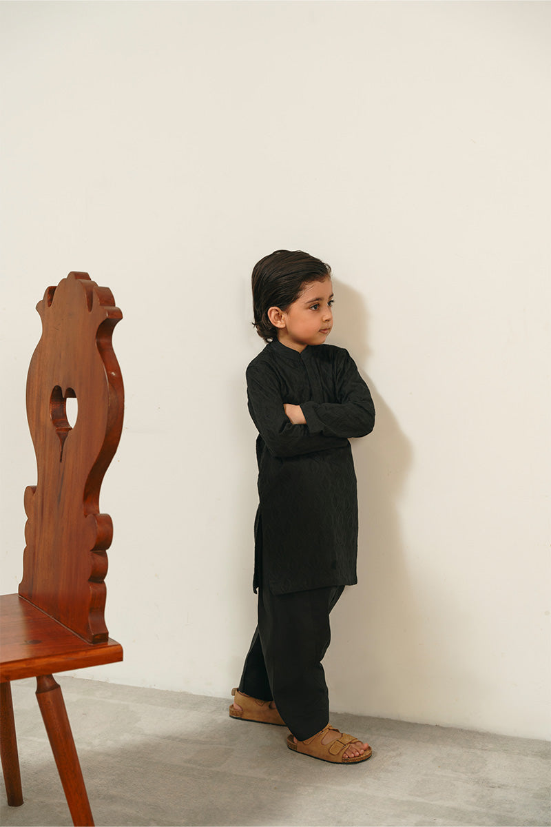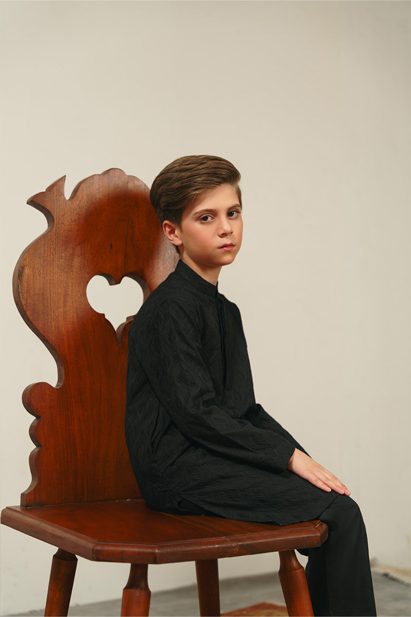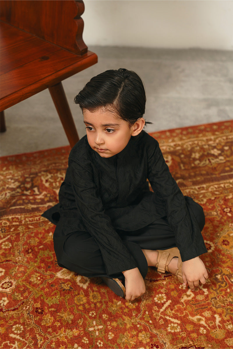 A black kurta in a premium cotton fabric detailed with a ban collar and hidden placket with all over floral and geometric chikankari embroidery.